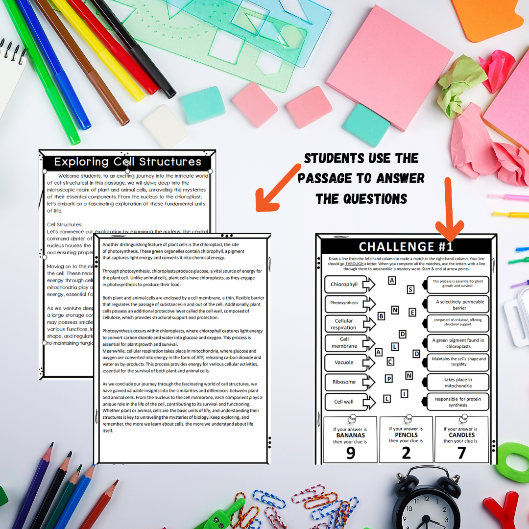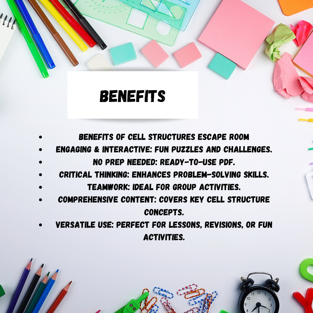 Unlock the excitement of learning about cell structures with our "Cell Structures Escape Room" activity! Spark competition, enhance comprehension, and make revision fun for your students. Download now and watch as your learners immerse themselves in this engaging educational adventure!
