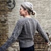 Earthy but elegant Benthe has several eye-catching features that make her stand out from the crowd. First of all of course the decadent cabled sleeves that seem to grow organically out of the 2 x 2 rib at the sleeve cap. Then there’s the interesting construction that results in a modified drop shoulder shape with some simple cabling along the armholes and the back raglan lines.