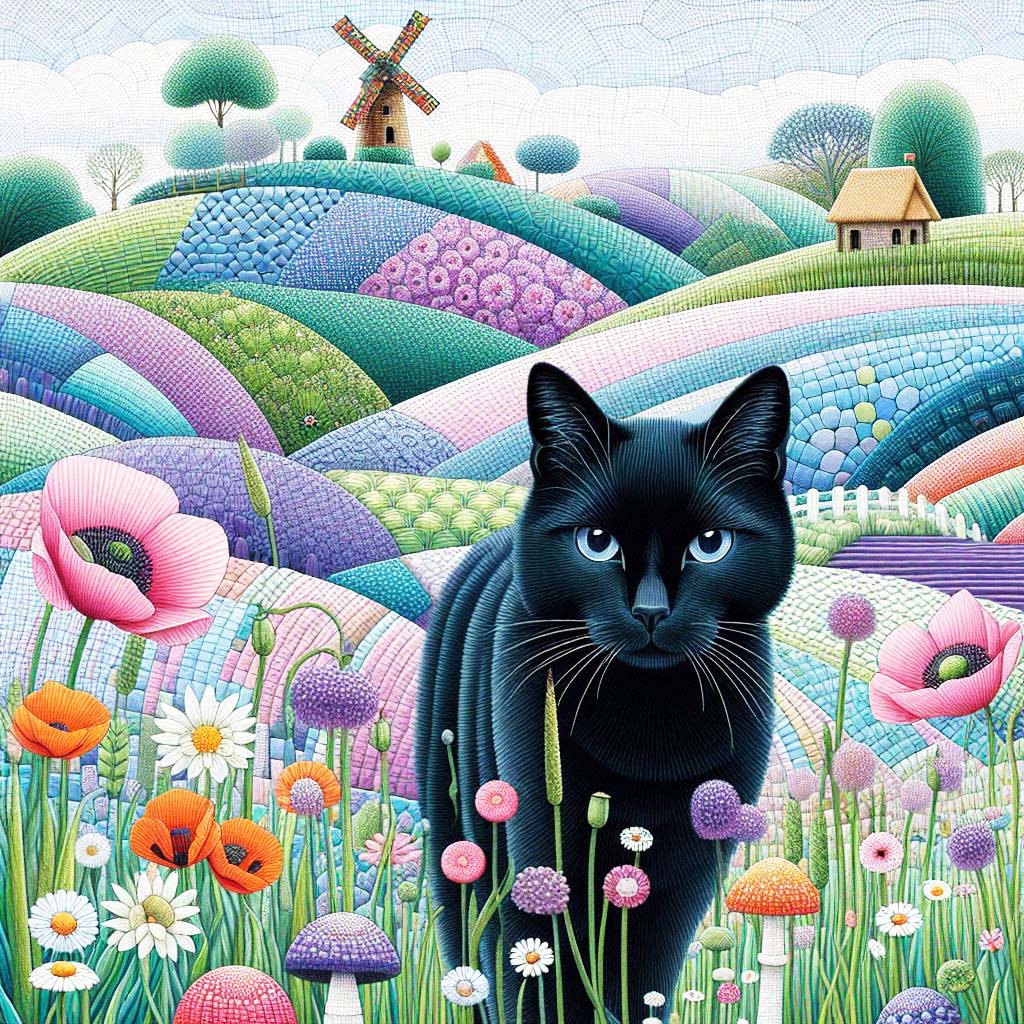 Playful Black cat & high patterned hills with poppies, daisies, & toadstools. There are small houses at the top of hills & a windmill made of colourful mosaics.