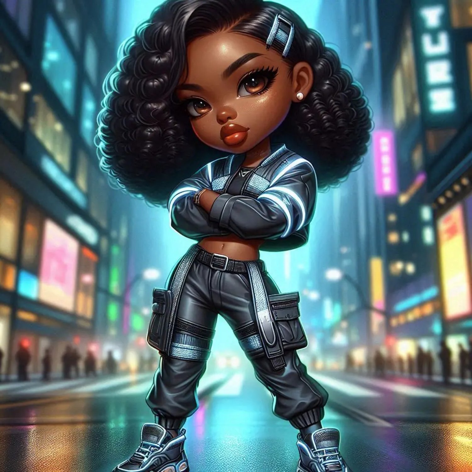 This chibi features a cute yet powerful curvy melanin character with glossy skin, big expressive eyes, voluminous curls, and a street-style outfit dripping in attitude. Set in a glowing urban night city, she stands fearless and confident—perfect for anyone who loves stylish, modern chibi aesthetics.