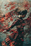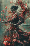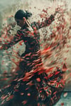These striking images capture the fiery spirit of Flamenco through a dynamic interplay of shadow and color. The dancer is depicted in mid-twirl, her dress a blur of passionate reds and deep blacks, mirroring the intensity and fervor that Flamenco embodies. The movement is frozen in time yet suggests a continuous, fervent performance that beckons the viewer to feel the dance's music and raw emotion.
