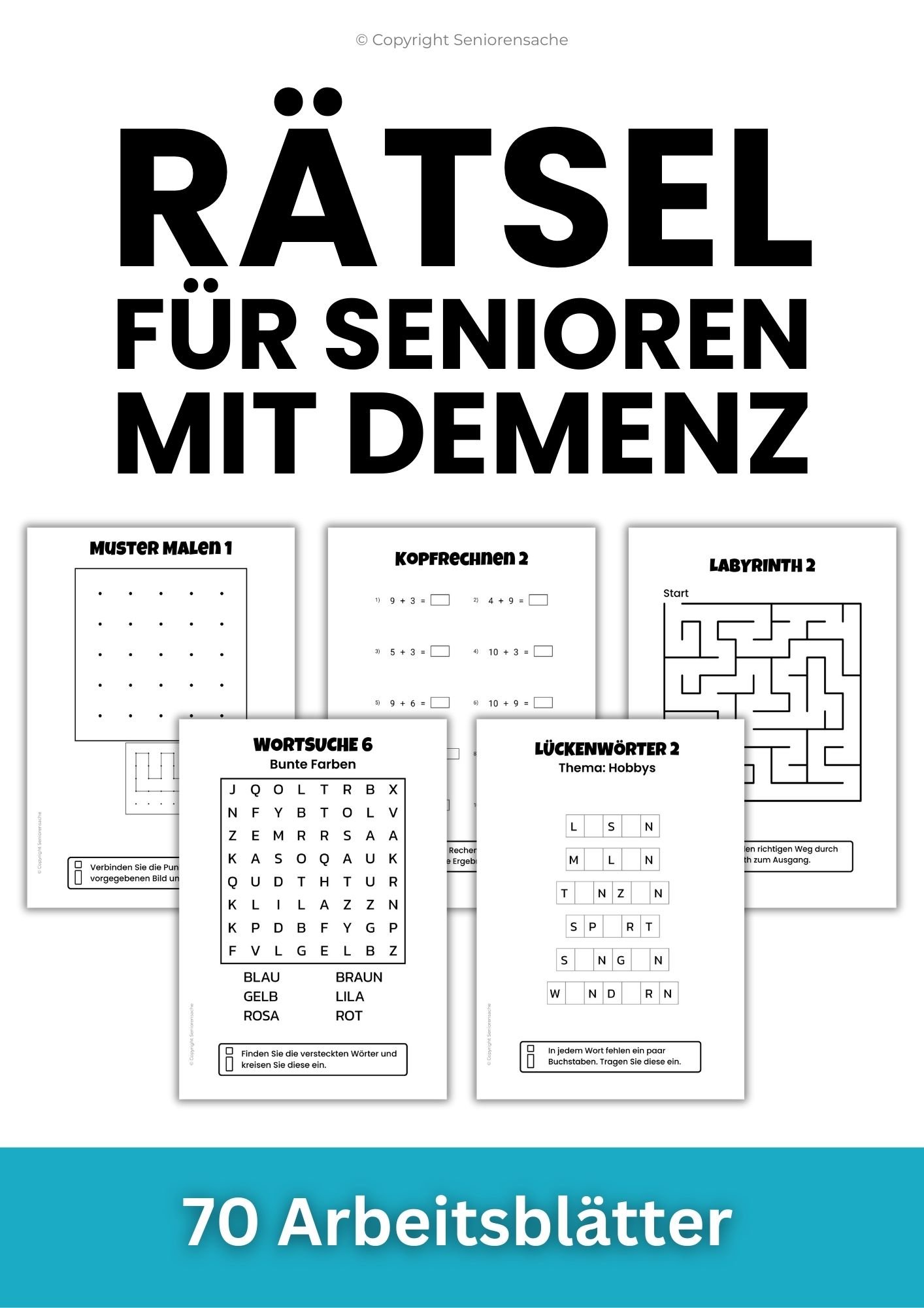 Dieses PDF enthält 70 abwechslungsreiche Rätsel und Übungen speziell für Senioren mit Demenz.