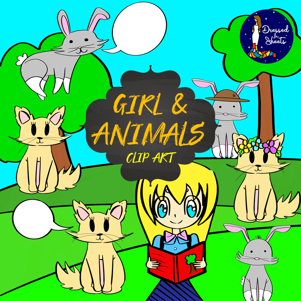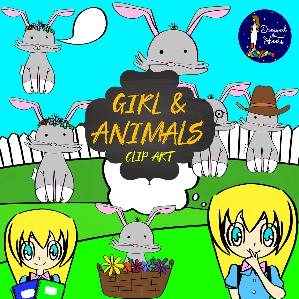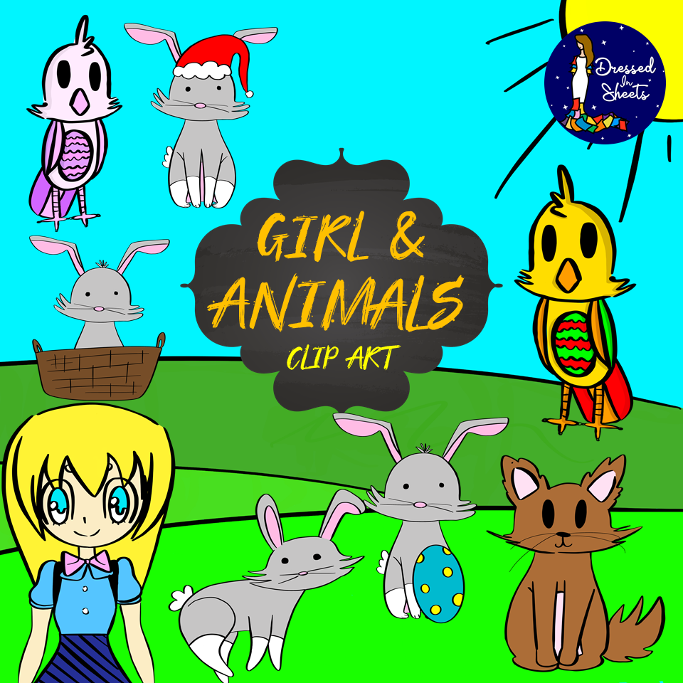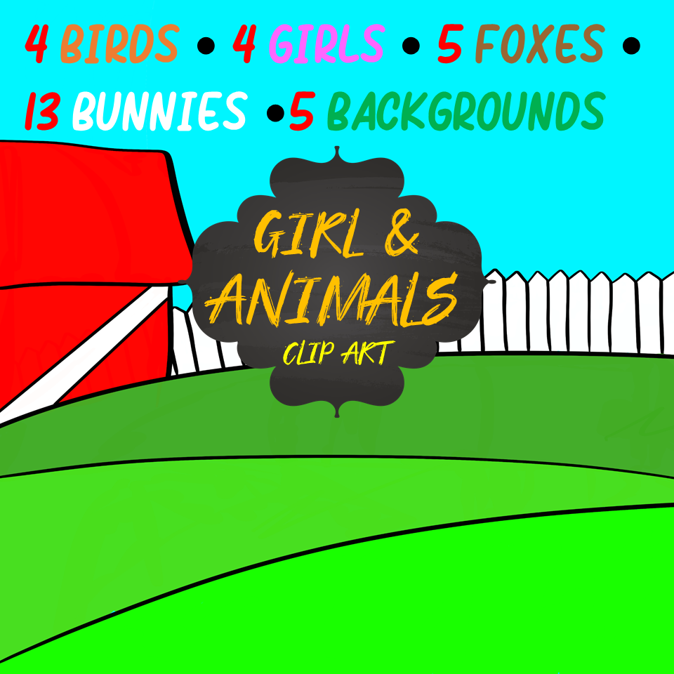 Girl and Animals Clip art collection contains 4 birds, 4 girls, 5 foxes, 13 bunnies, 5 backgrounds.