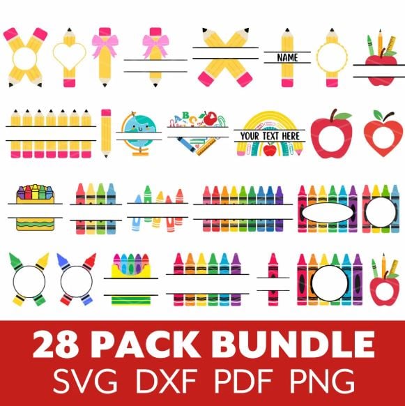 Take your crafting to the next level with the School Split Monogram SVG Bundle, showcasing 28 one-of-a-kind designs inspired by crayons, pencils, and school-related themes.