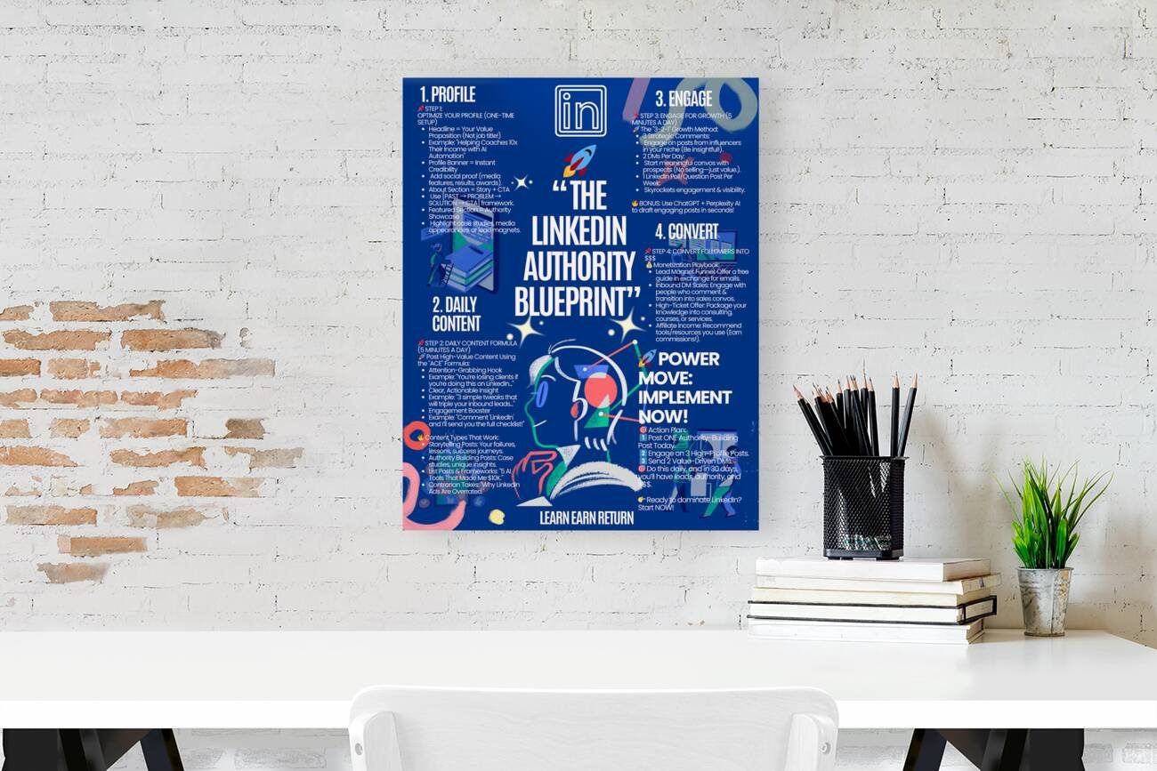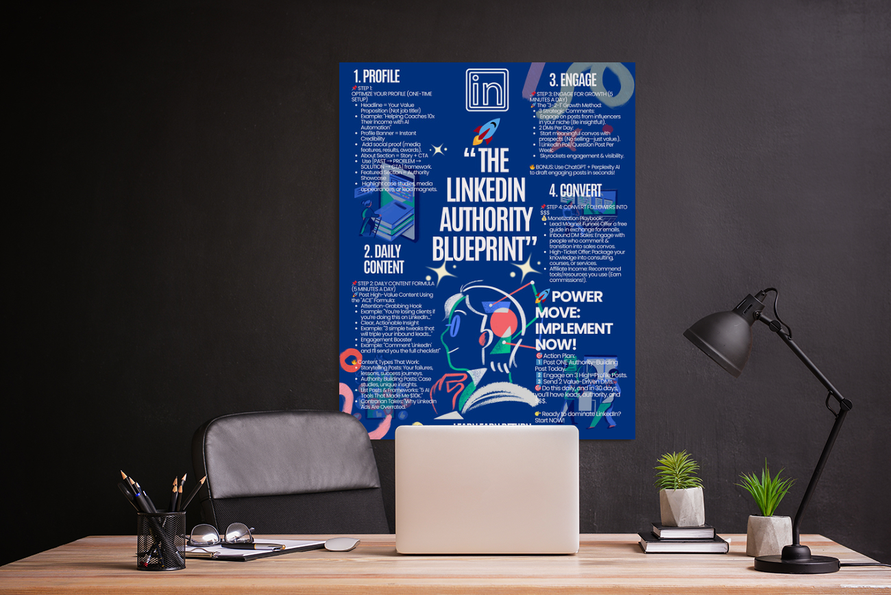 Introducing "The LinkedIn Authority Blueprint", a one-page infoposter that provides a clear, step-by-step plan to dominate LinkedIn. This guide is perfect for time-poor professionals who need quick, action-oriented advice.
