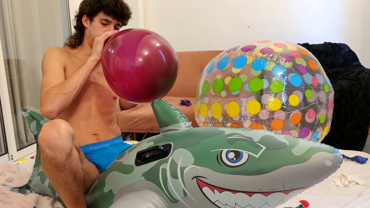 In this video the cute twink Charles Blow and burst balloons while riding one bestway inflatable shaark and one intex inflatable beach balloon.