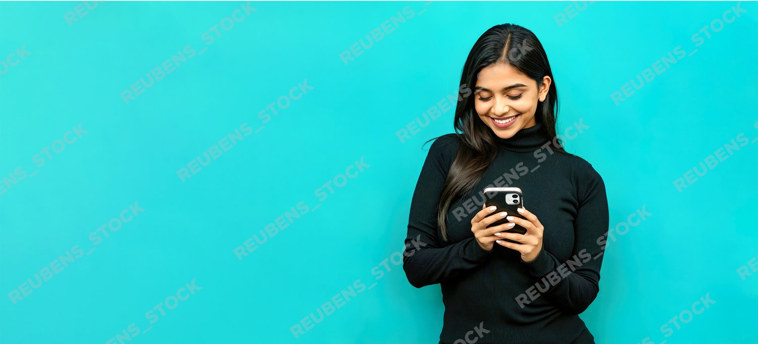 Happy Indian Female Texting on Smartphone Against Blue Background