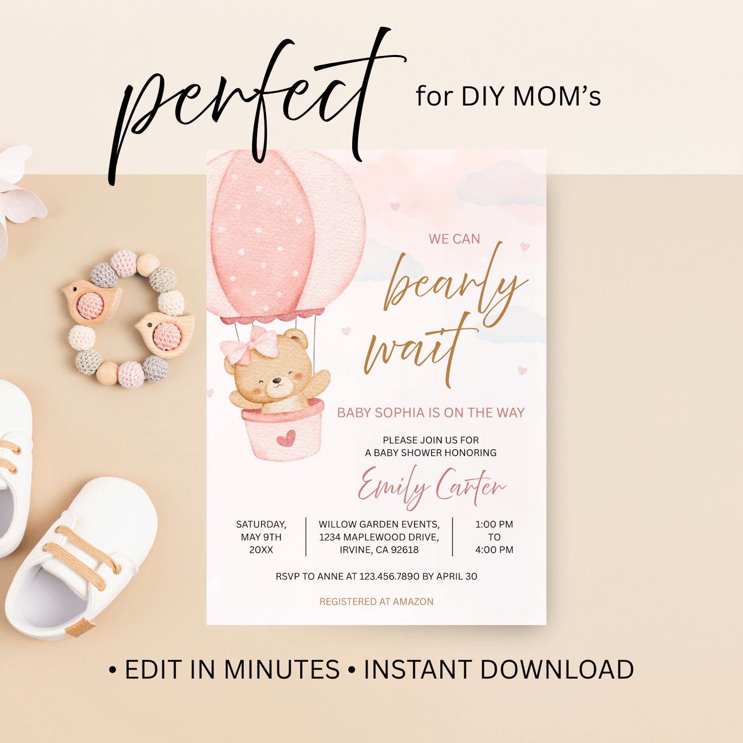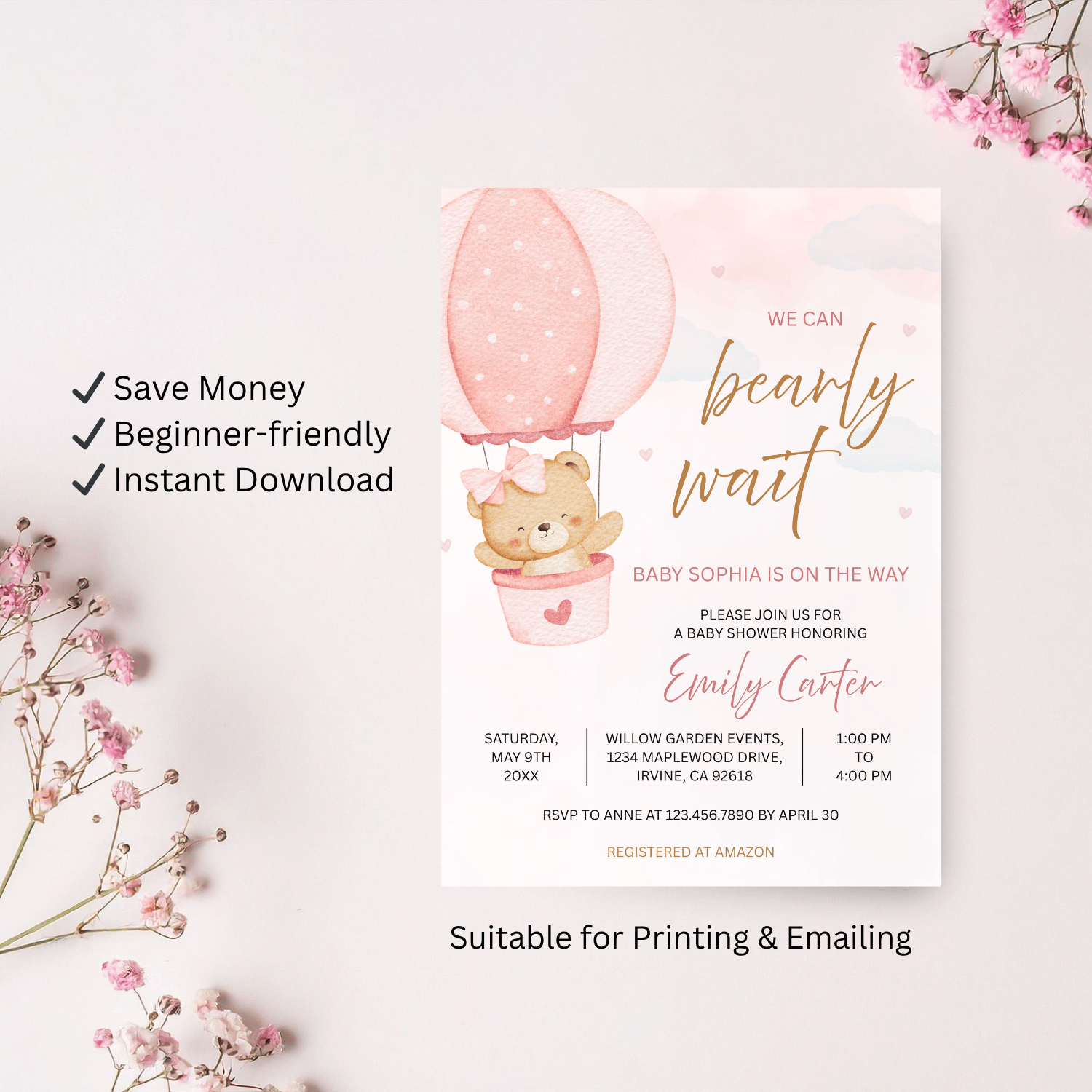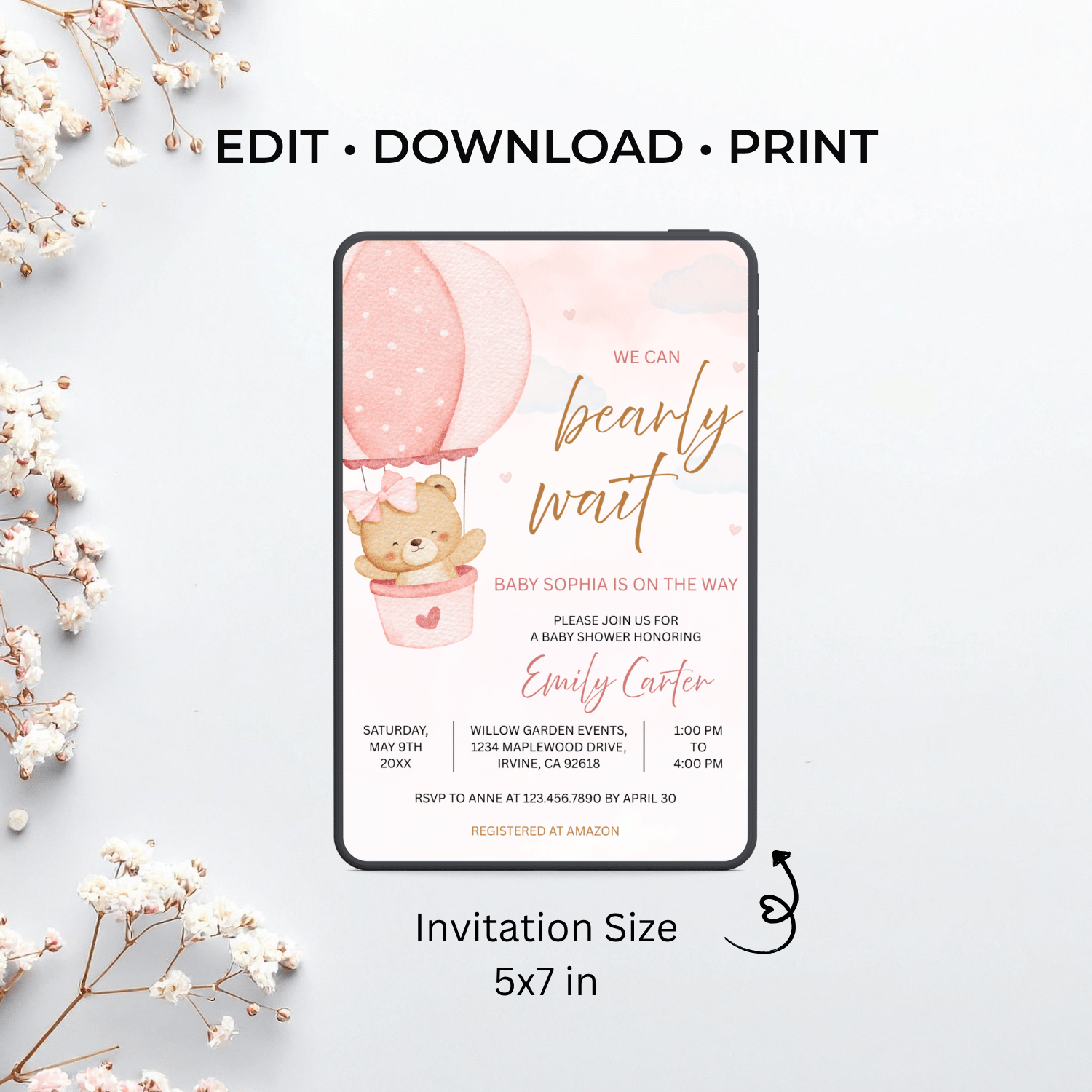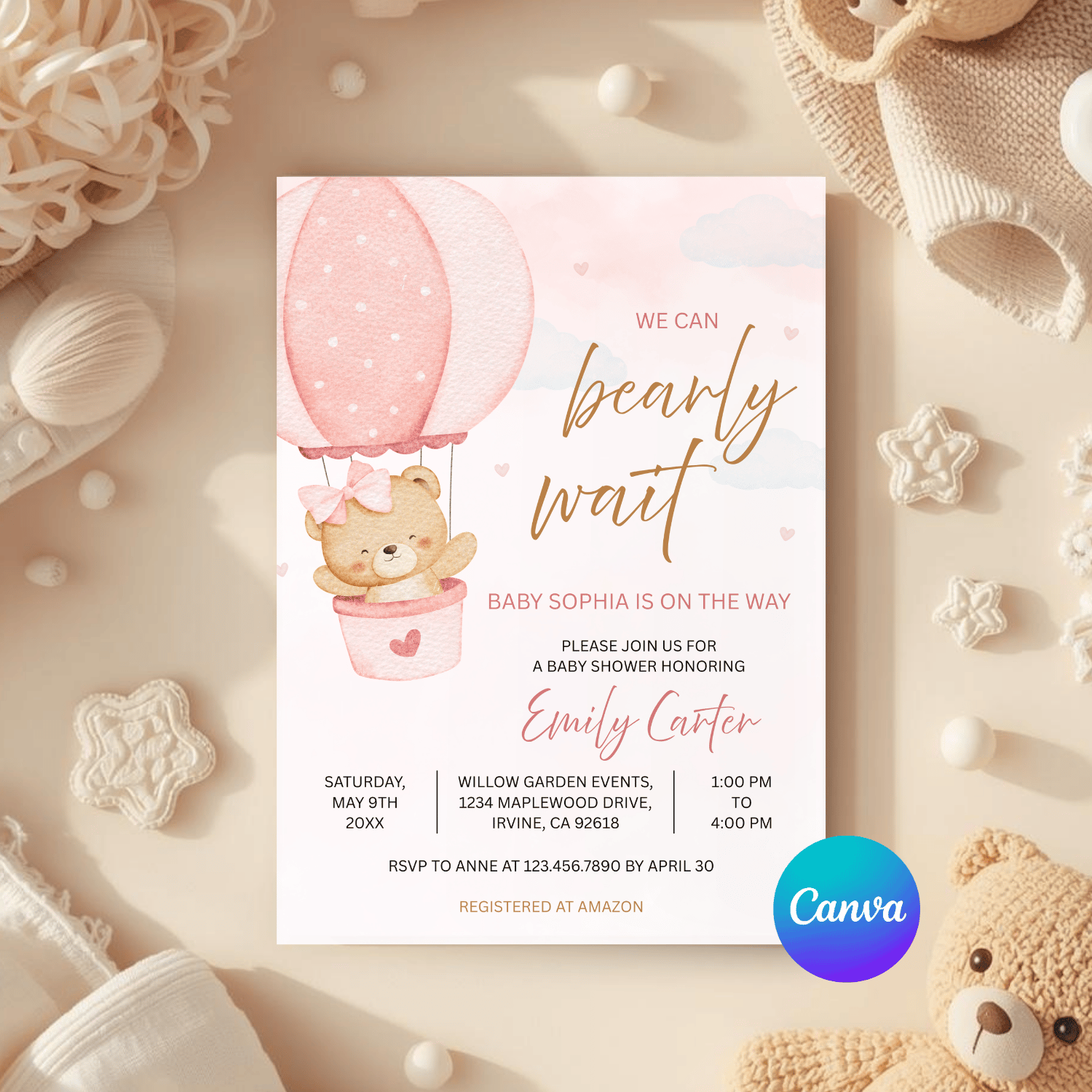 BBY008 We Can Bearly Wait Baby Shower Invitation Template | Teddy Bear Hot Air Balloon Invite | Editable Text in Canva | Instant Download