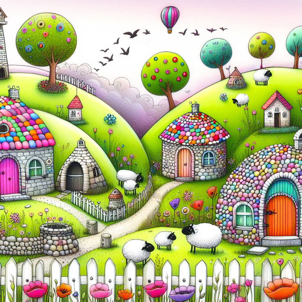 A whimsical world. Round houses made of bright colourful pebbles with white picket fences. fields with black & white sheep. There are big round hills with poppies, apple trees & a hot air balloon. There are birds flying in a cloudy purple sky.