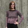 This garment is worked top-down, in the round. The neckband can be worked in either the main or contrast colour, after which short row shaping is incorporated to optimise fit. The majority of the yoke features a stranded colourwork pattern. Once the yoke is completed, stitches are separated into body and sleeves, which are each worked separately and in the round. The stranded colourwork pattern is worked in the upper body and sleeves, then the remainder of each is worked in stockinette to the waistband and cuffs. Included in the pattern is an option to extend the colourwork through the majority of the body and sleeves, if preferred.