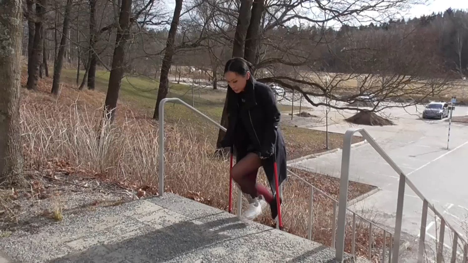 Poor Bunny is in a red long leg cast and when she is crutching up for some steps she suddenly fall.I hope she not hurt her more now!