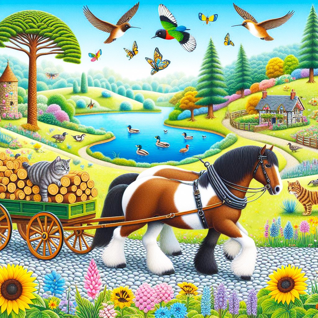 Beautiful horses & cat beside a lake. There are trees, flowers, cats & birds.