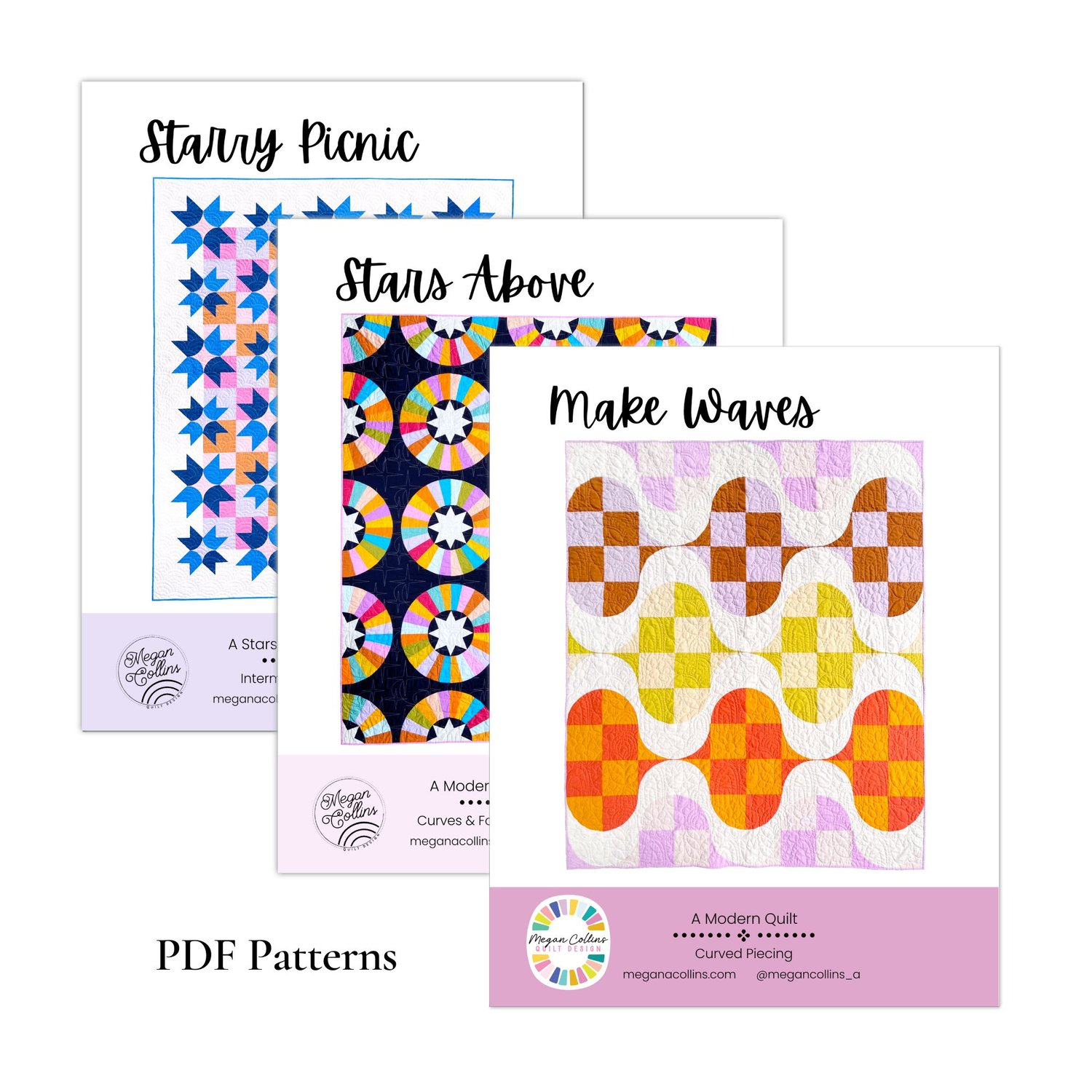 A PDF pattern bundle including Make Waves, Stars Above, and Starry Picnic quilt patterns.