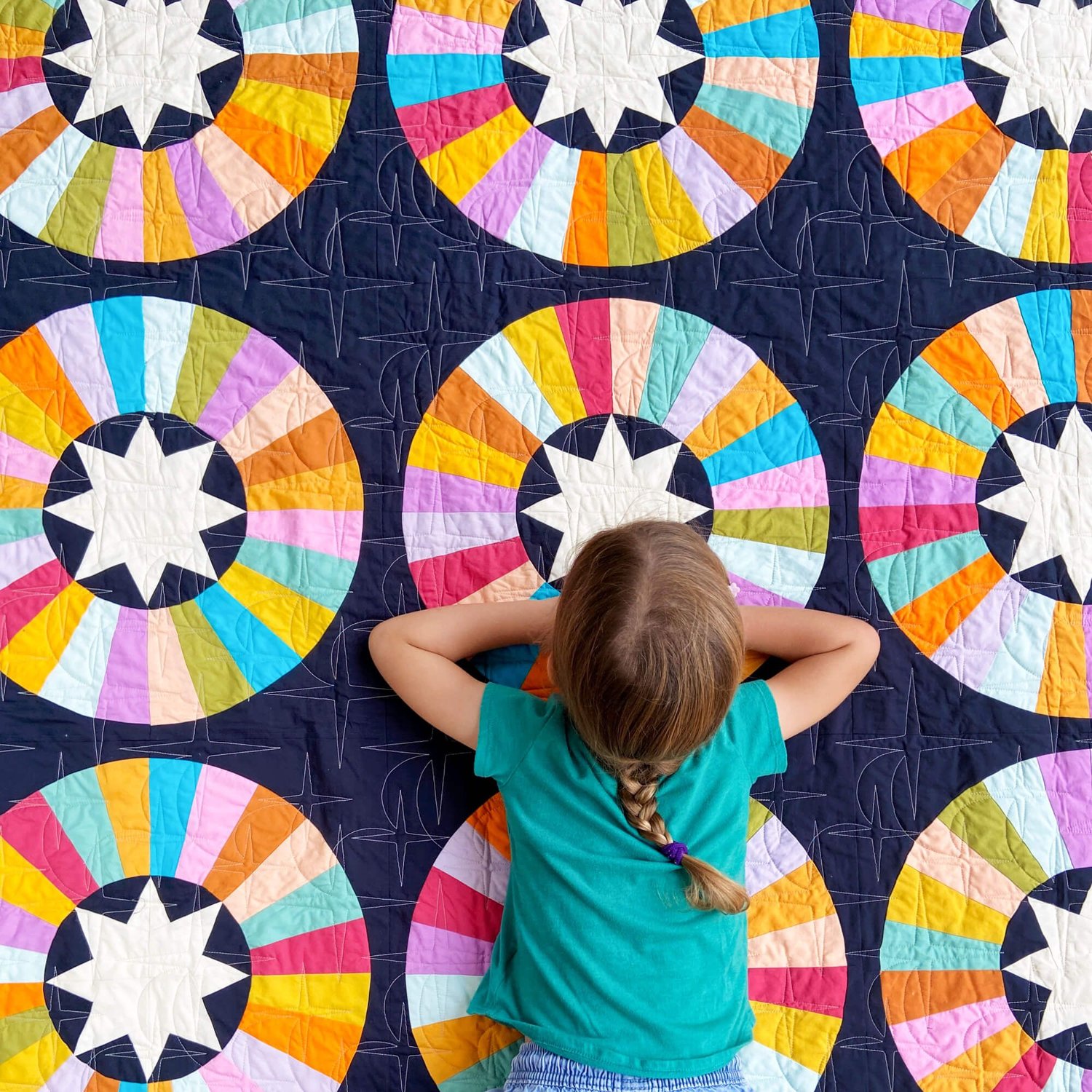 Stars Above is a sparkly modern traditional quilt. The pattern uses beginner level foundation paper piecing and intermediate level curve piecing. The pattern includes charts and clearly illustrated step-by-step instructions for making baby-king size quilts.