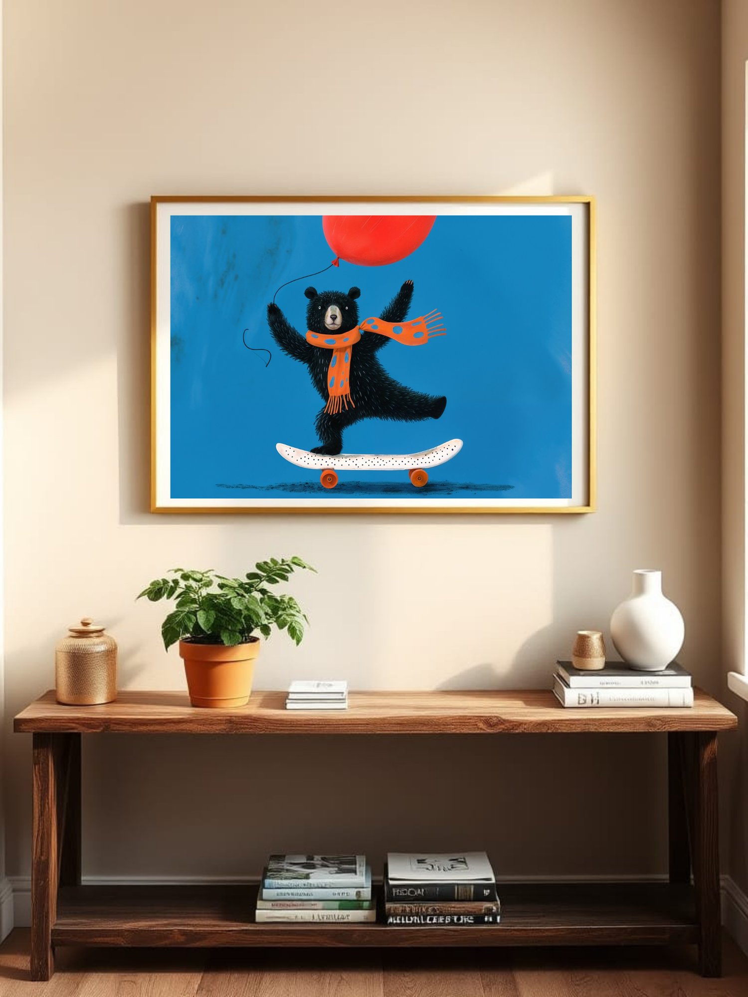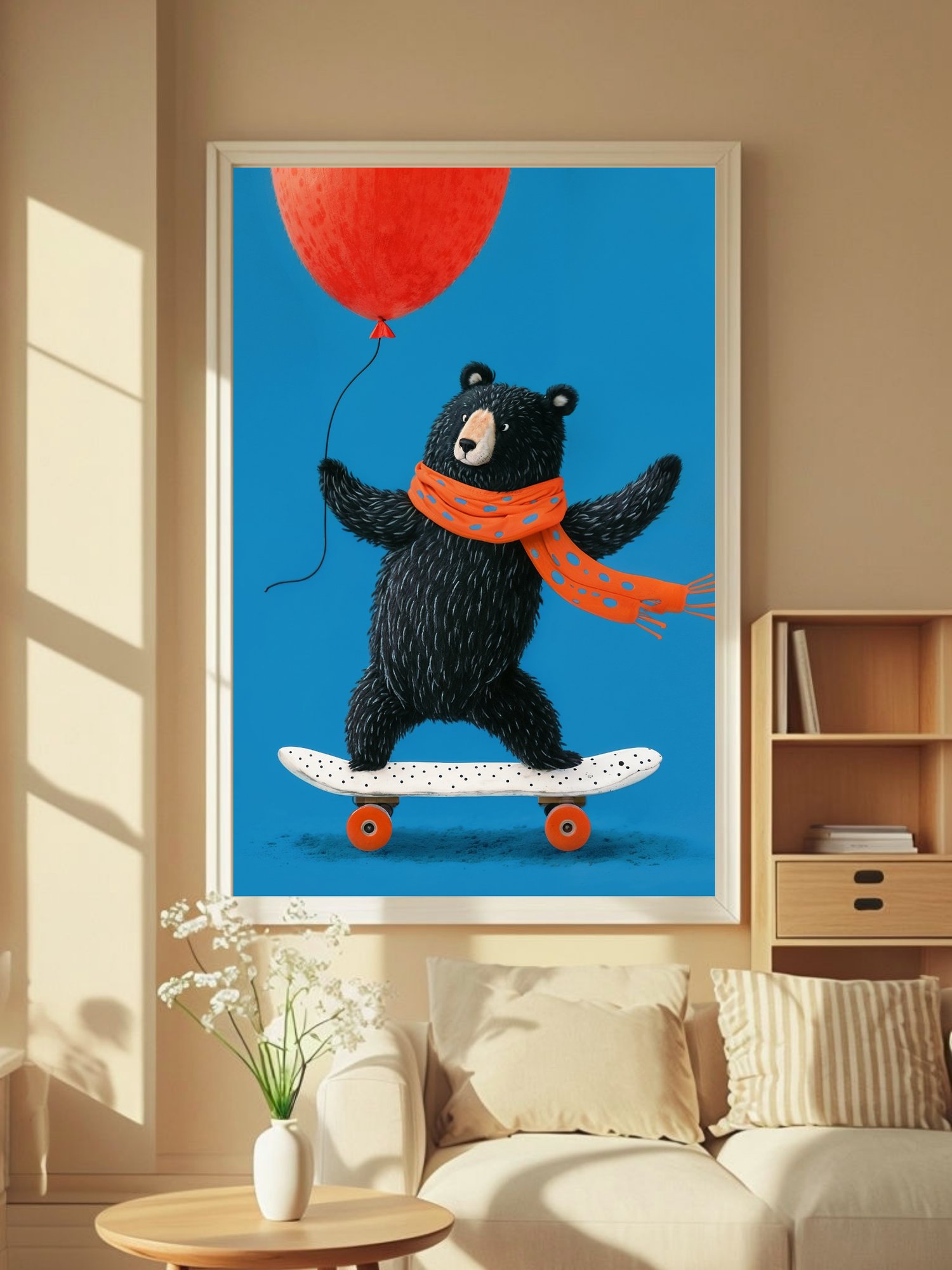 Bring a burst of fun and adventure to your space with this adorable Playful Bear on Skateboard digital art! This high-quality printable features a charming black bear balancing on a skateboard, holding a bright red balloon, and wrapped in a cute orange scarf — perfect for adding a touch of whimsy to kids’ rooms, nurseries, or playful home corners.