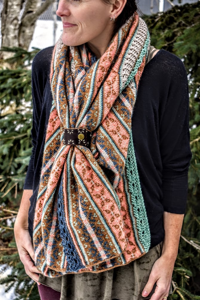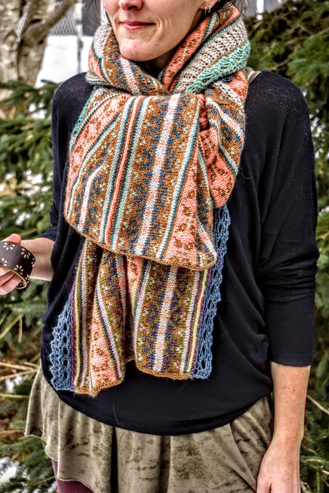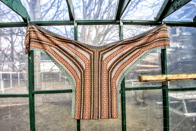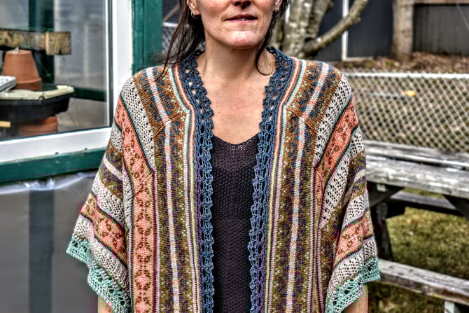 Conch are some of the most beautiful creatures of the sea, but the most beautiful might be the ones with psuedoconch -- the Sea Butterfly. This enormous ruana wrap is worked in one piece; after the first half is complete, stitches are picked up to work the second half. Pattern is written so that you can either 1) work the stranded colourwork in the round with a steek, or 2) work the stranded colourwork flat with no steek. After the entire body of the wrap is complete, unique applied edging is worked around the entire outer perimeter.