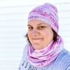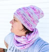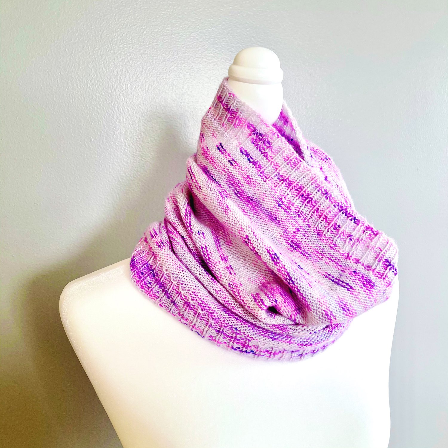 This pattern includes written instructions for one size cowl in two versions (solid single color version and multicolored stripey version).