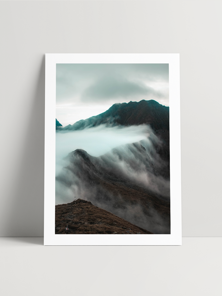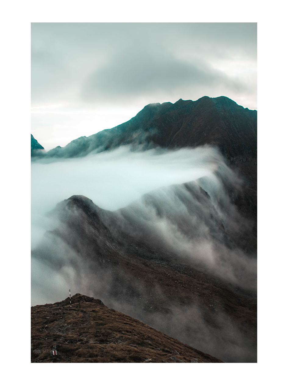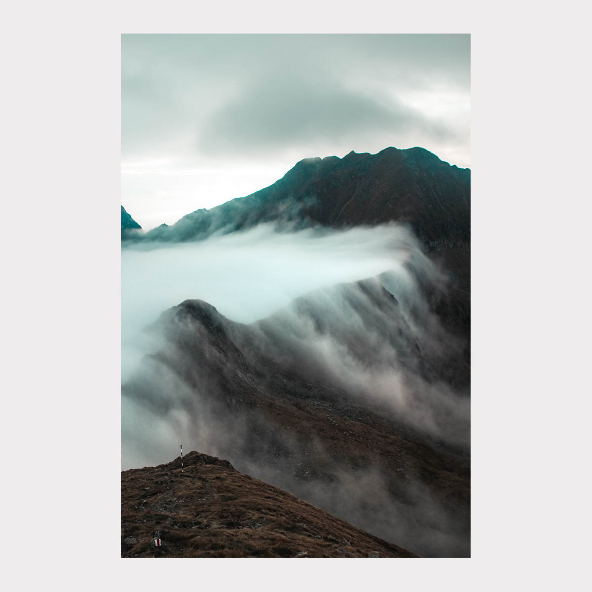 Cette photo, je l’ai prise lors de l’une des randonnées les plus difficiles et les plus magnifiques de ma vie, dans les montagnes roumaines. On y voit une longue crête sombre qui traverse la photo en diagonale, comme un trait de roche jeté dans le paysage. Derrière elle, une mer de nuages immaculée remplit toute la vallée, douce et blanche comme une mer de coton. Et sur les flancs de la crête, les nuages s’écoulent en cascades, comme s’ils étaient devenus liquides, glissant lentement le long des parois. Quelques minutes auparavant, j’avais marché sur cette même crête par un ciel totalement dégagé. En me retournant depuis le sommet suivant, j’ai découvert un miracle : le même chemin, mais transformé en rempart majestueux, soutenant cette mer de nuages. Les éléments semblaient dialoguer, se répondre, s’égaler. C’était un moment suspendu, où tout — la roche, le vent, les nuages — formait une harmonie parfaite.