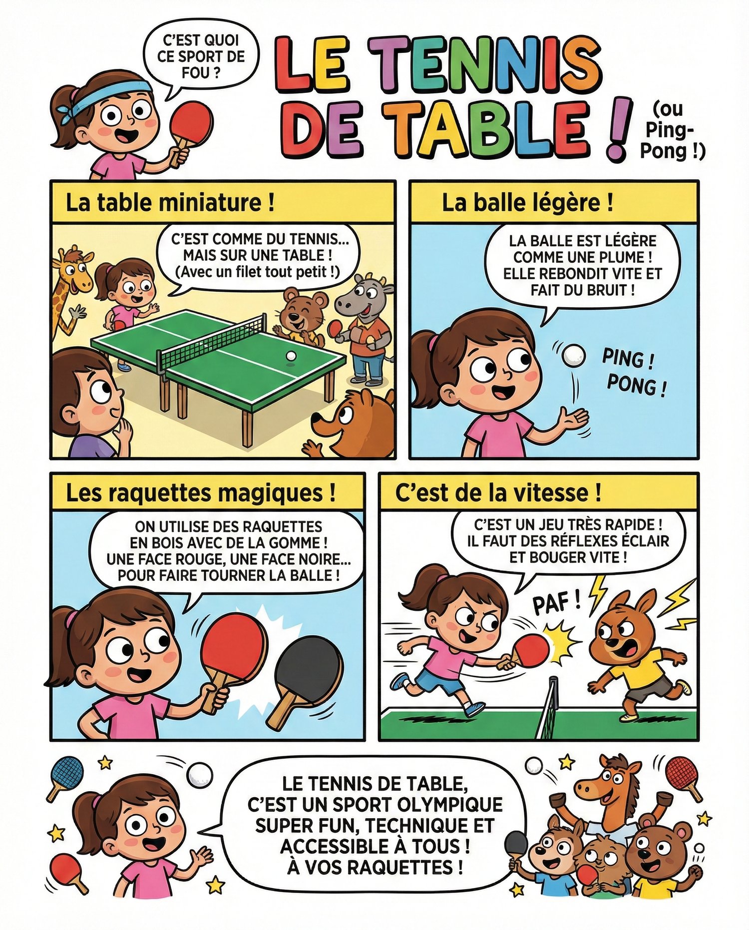 Cette ressource présente un sport entièrement en français à travers une série de pages infographiques au style clair et dynamique inspiré de la bande dessinée franco-belge.