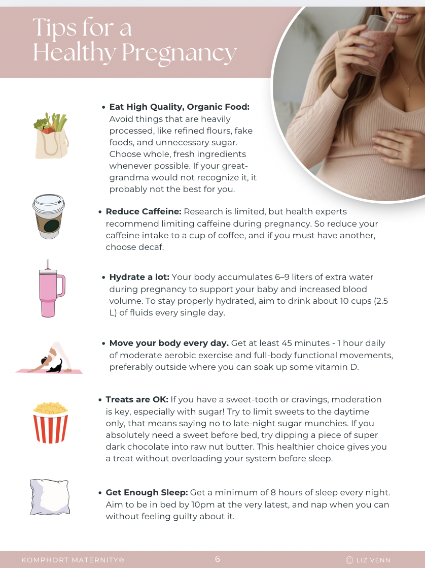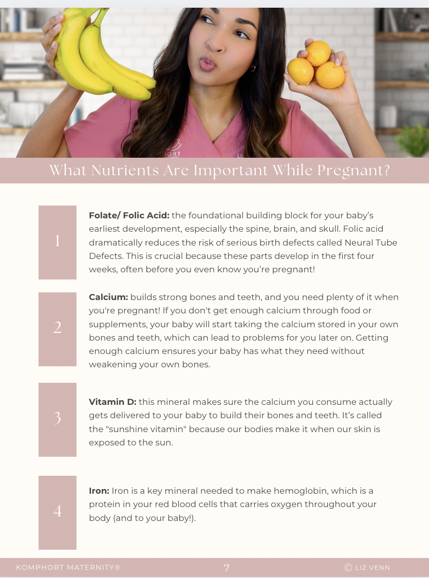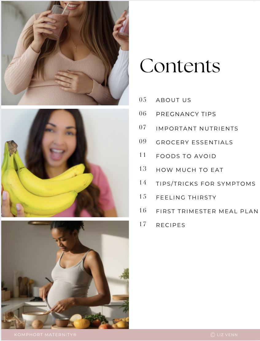 I'm Liz, a Registered Nurse and Kinesiologist, certified as a Birth & postpartum doula, Childbirth Educator and Breastfeeding Specialist. I’m also the founder of Komphort Maternity, a wellness brand dedicated to fertility, pregnancy, birth, and postpartum education. This guide was created in collaboration with a Registered Nutritionist and Dietitian with clinical and one-on-one coaching experience.