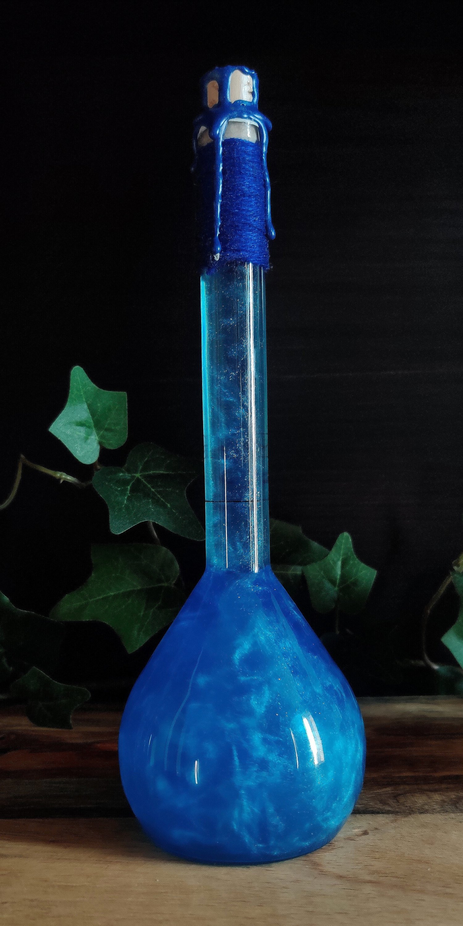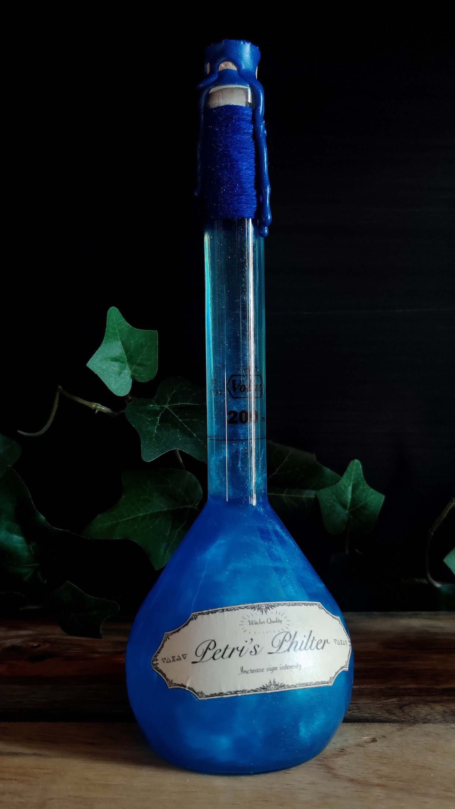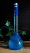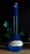 Pullossa on sinistä nestettä ja se on koristeltu käsintehdyllä etiketillä ja sinisellä narulla.