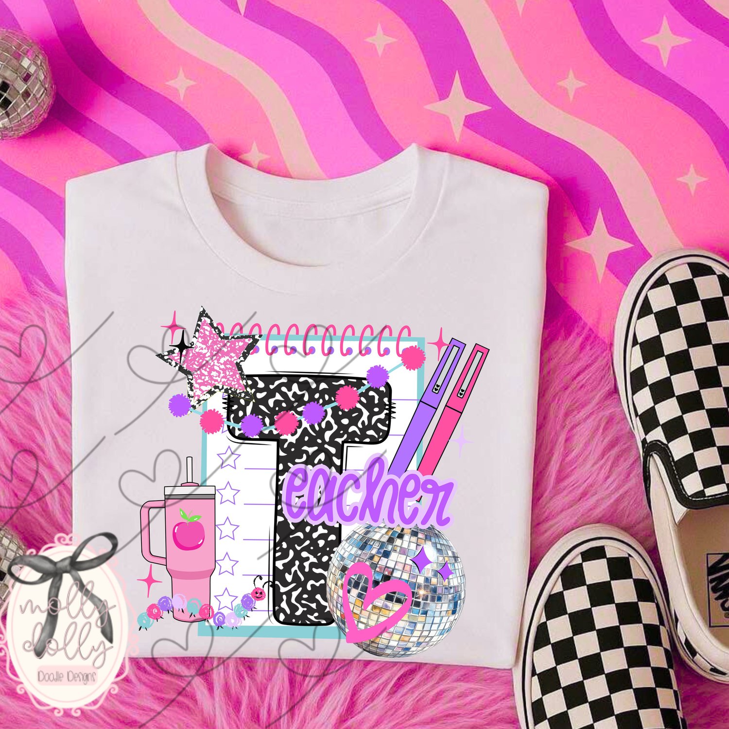 ✅ Fun Retro Teacher Design – Features neon star, pencil, disco ball, roller skate bus & notebook “T”