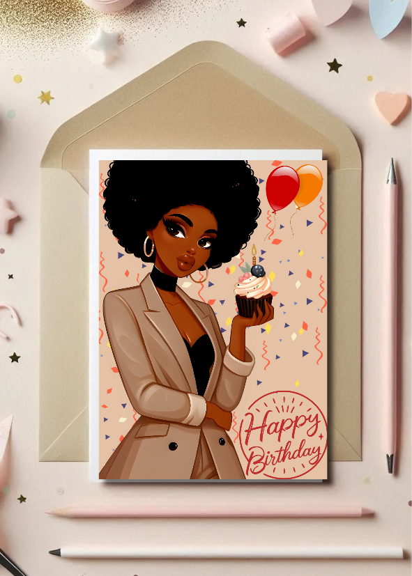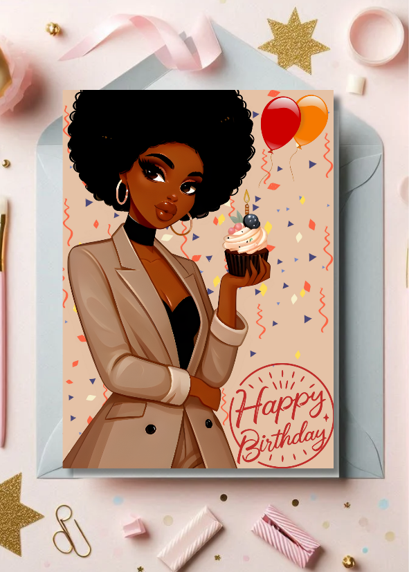 Celebrate in style with this Glamorous Black Girl digital birthday card, perfect for the modern woman who owns her power! Featuring a stunning Black woman with a beautiful afro in a chic taupe suit, this Afrocentric art card radiates confidence and sophistication. The festive background with confetti and balloons adds a joyful touch, making it ideal for any birthday celebration. This instant download e-card is a must-have for Black women, boss ladies, or any fashionable female who loves unique digital greetings. Get your printable birthday card today and send happy birthday wishes with Black girl magic!