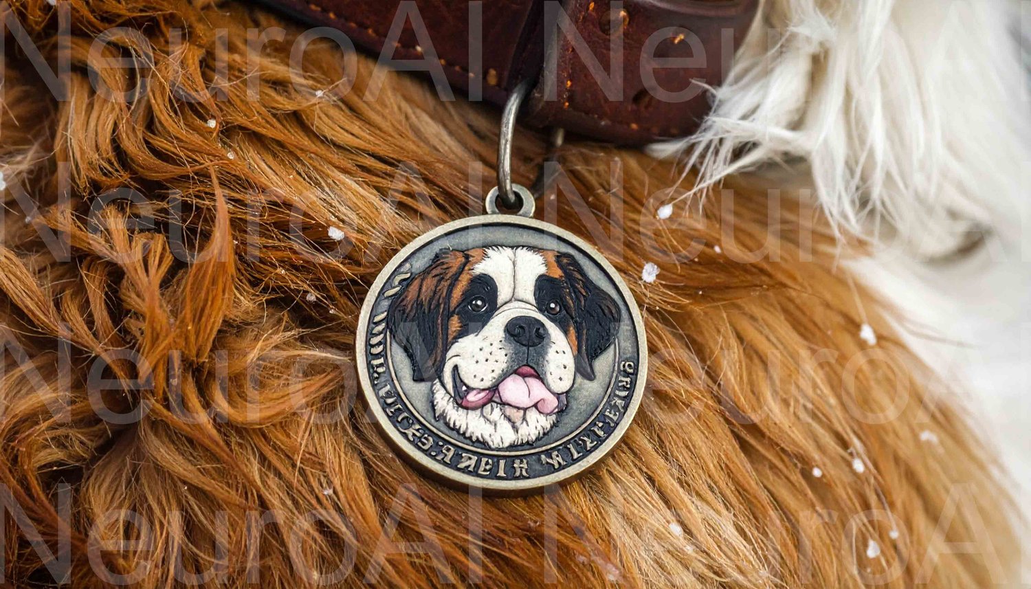 Saint Bernard pet tag on fluffy dog fur closeup