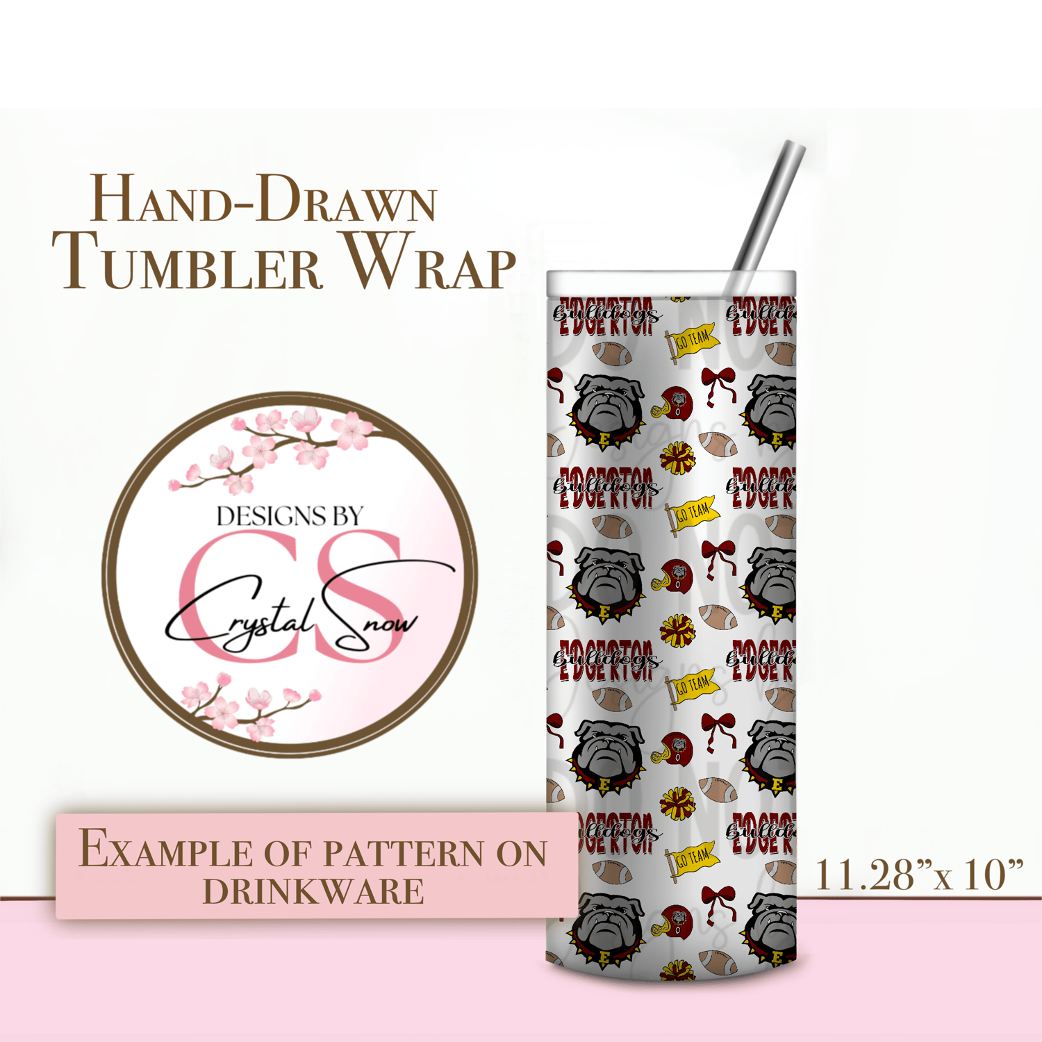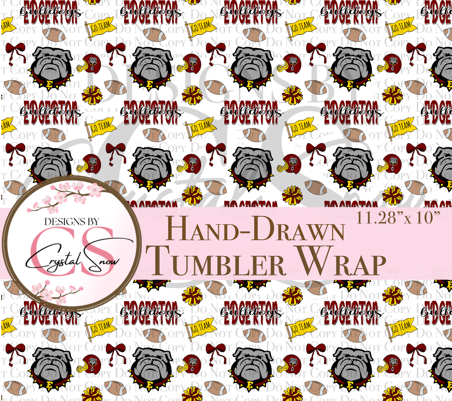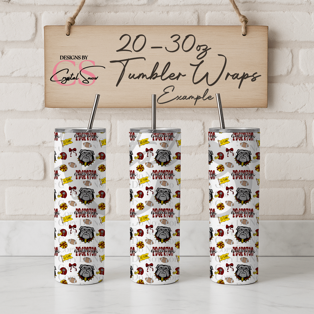 This 20 oz or 30 oz skinny tumbler wrap features Edgerton’s proud bulldog mascot, footballs, pom-poms, and bows in classic maroon, gold, and gray. Perfect for sublimation and small business designs, it’s hand-drawn with love for Friday-night lights and hometown pride.