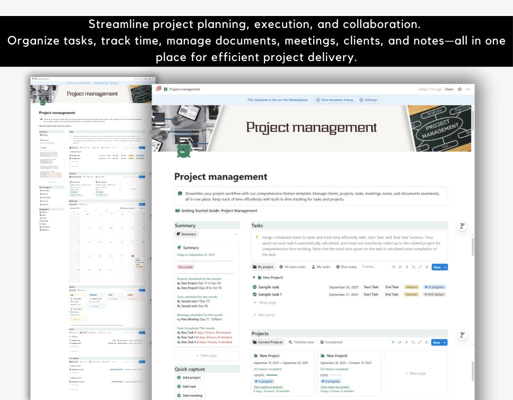 The Project Management template is a comprehensive, integrated workspace built on the philosophy of Minimal Clarity—giving you the right insights, at the right time, without drowning in administrative noise. From time tracking to progress monitoring, this system ensures you stay focused on high-impact execution.