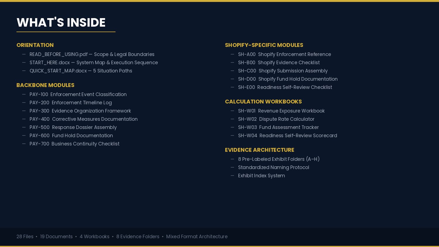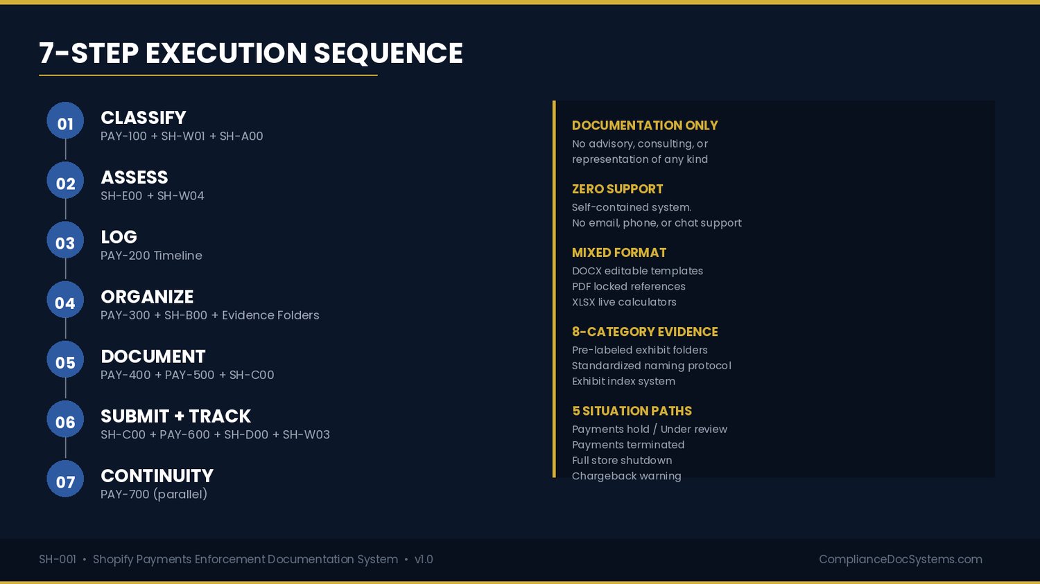 Structured documentation framework for organizing and assembling a submission-ready response packet following a Shopify Payments hold or store shutdown.