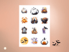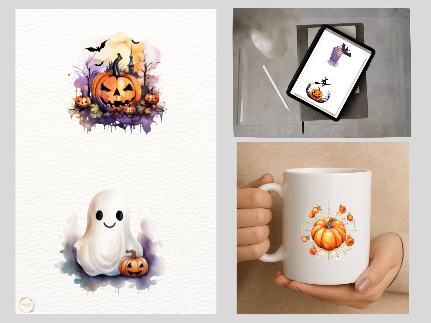 β’ Watercolor designs of ghosts, pumpkins, and gravestone.