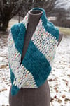 This scarf is crocheted on the bias, resembling a long parallelogram, then joined by sewing or slip stitching to make a circle.