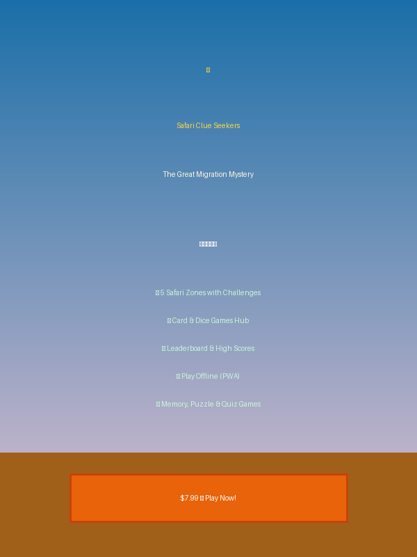 Safari Clue Seekers - Interactive Educational Adventure GameAn engaging safari-themed educational game with 5 learning zones:- Animal facts and habitat exploration- Interactive mini-games (cards, dice, board games)- Educational quizzes on wildlife- Leaderboard for motivation- Progressive difficulty levelsPerfect for:- Students (elementary to middle school)- Teachers looking for interactive learning tools- Parents seeking educational entertainment- HomeschoolersOne-time purchase - full game access, no subscriptions.Play demo first: https://venerable-beijinho-2cd368.netlify.app