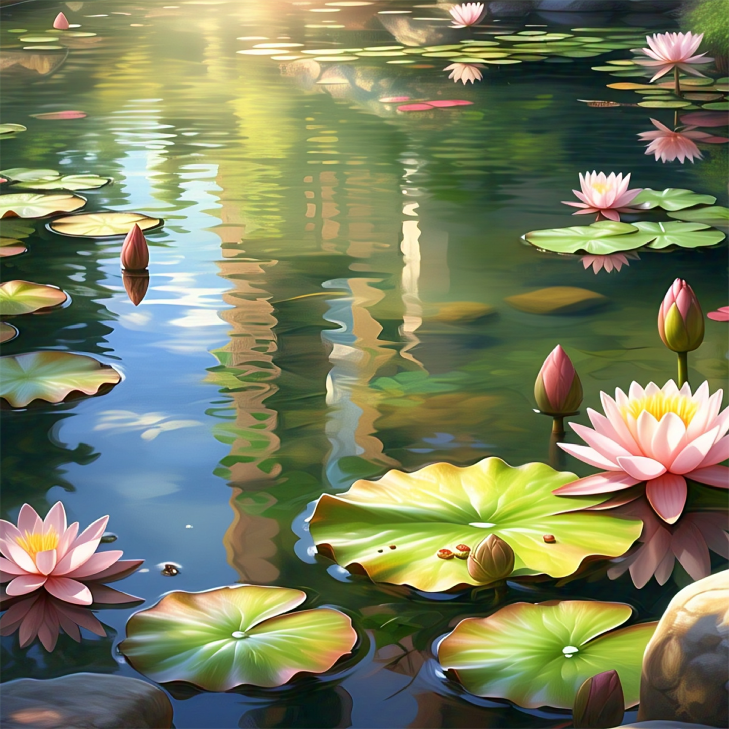 This tranquil artwork captures the lush serenity of a lotus pond basking in golden sunlight, rendered with a vibrant, almost ethereal quality. The surface of the water reflects the sun in dazzling streaks and soft, blended colors, creating beautiful movement and an illusion of great depth. Large, verdant lily pads rest on the surface, providing a perfect contrast to the star subjects: numerous pink and white lotus flowers and buds. The lighting is the centerpiece, hitting the water just right to illuminate the delicate petals and emphasize the cool, refreshing blues and greens of the natural environment, evoking a feeling of profound peace, growth, and meditation.