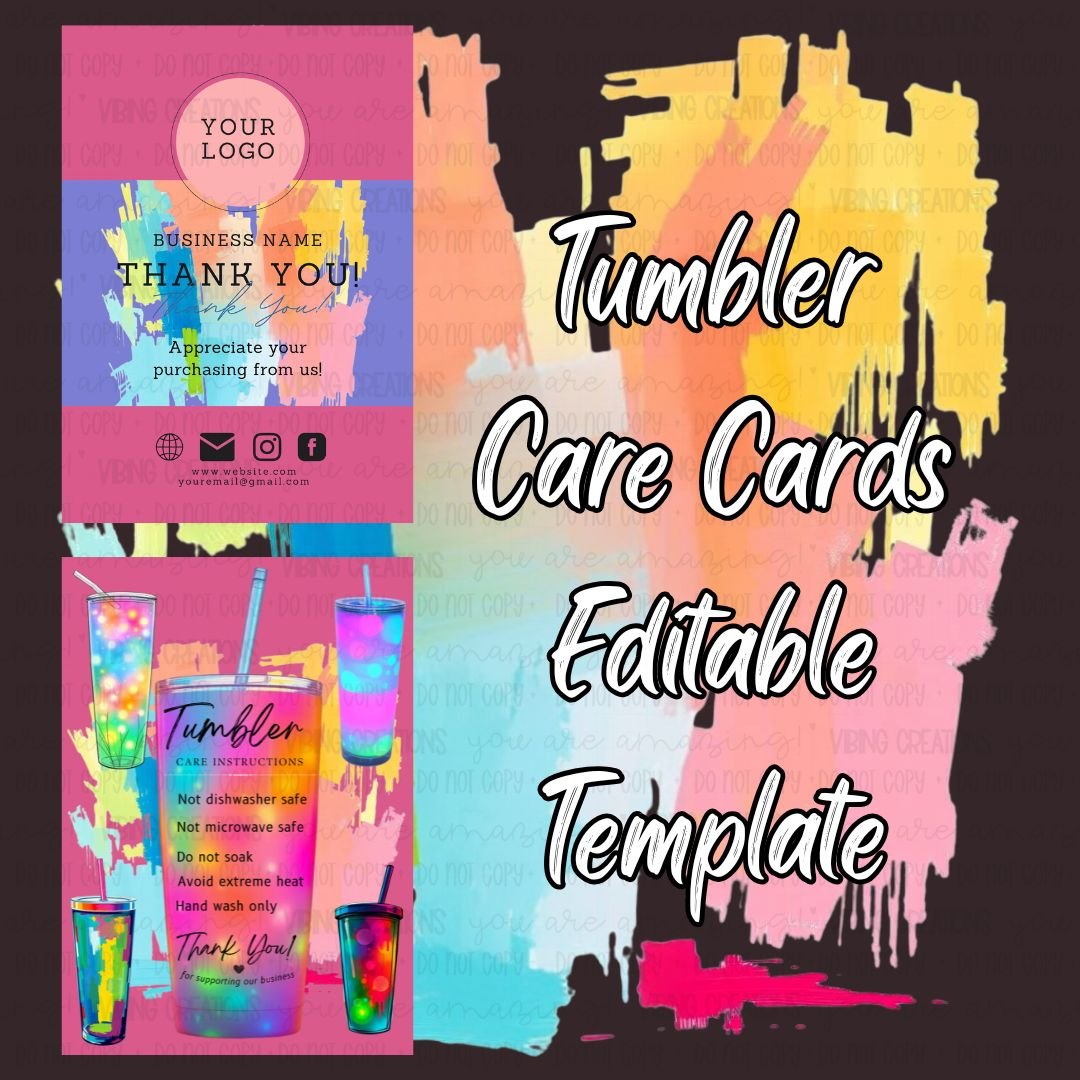 🎨 Editable Tumbler Care Card Templates – Vibrant & Customizable!
