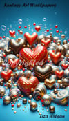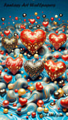 3D bouncing red gold & brown hearts floating on swirling patterned shapes on a blue water background with iridescent bubbles.