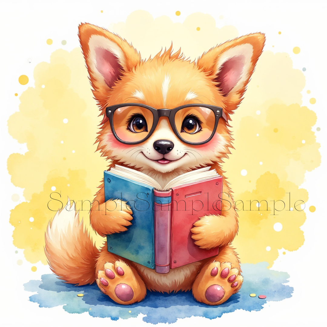 Add a touch of charm to your space with this adorable kawaii-style dog wearing glasses and reading a book, set against a soft watercolor background. Perfect for kids’ rooms, nurseries, libraries, or any cozy corner that could use a little cuteness.