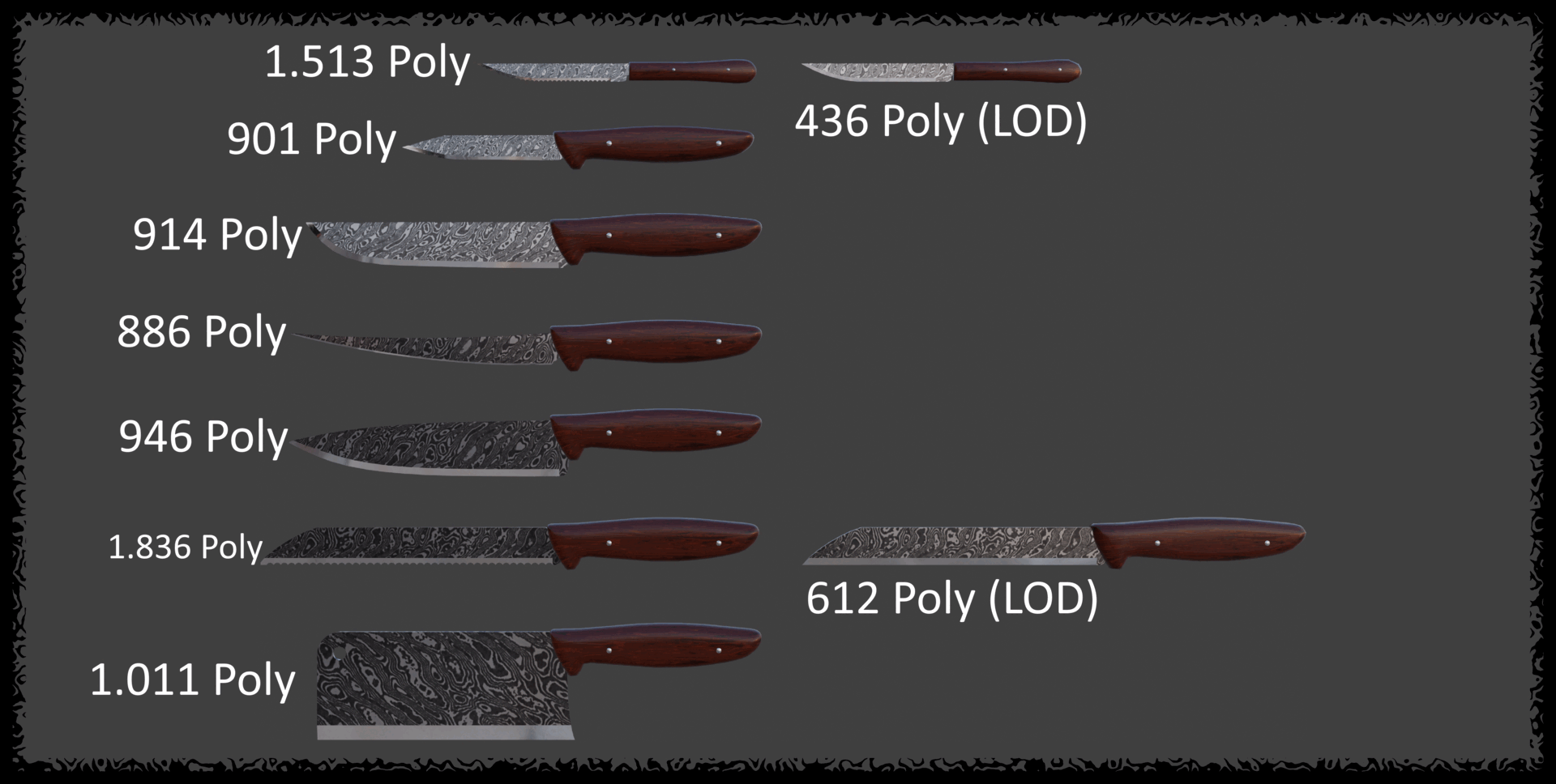 - 2 LOD models ( Low poly models ), one for the bread knife, and the other for the table knife for best performance;