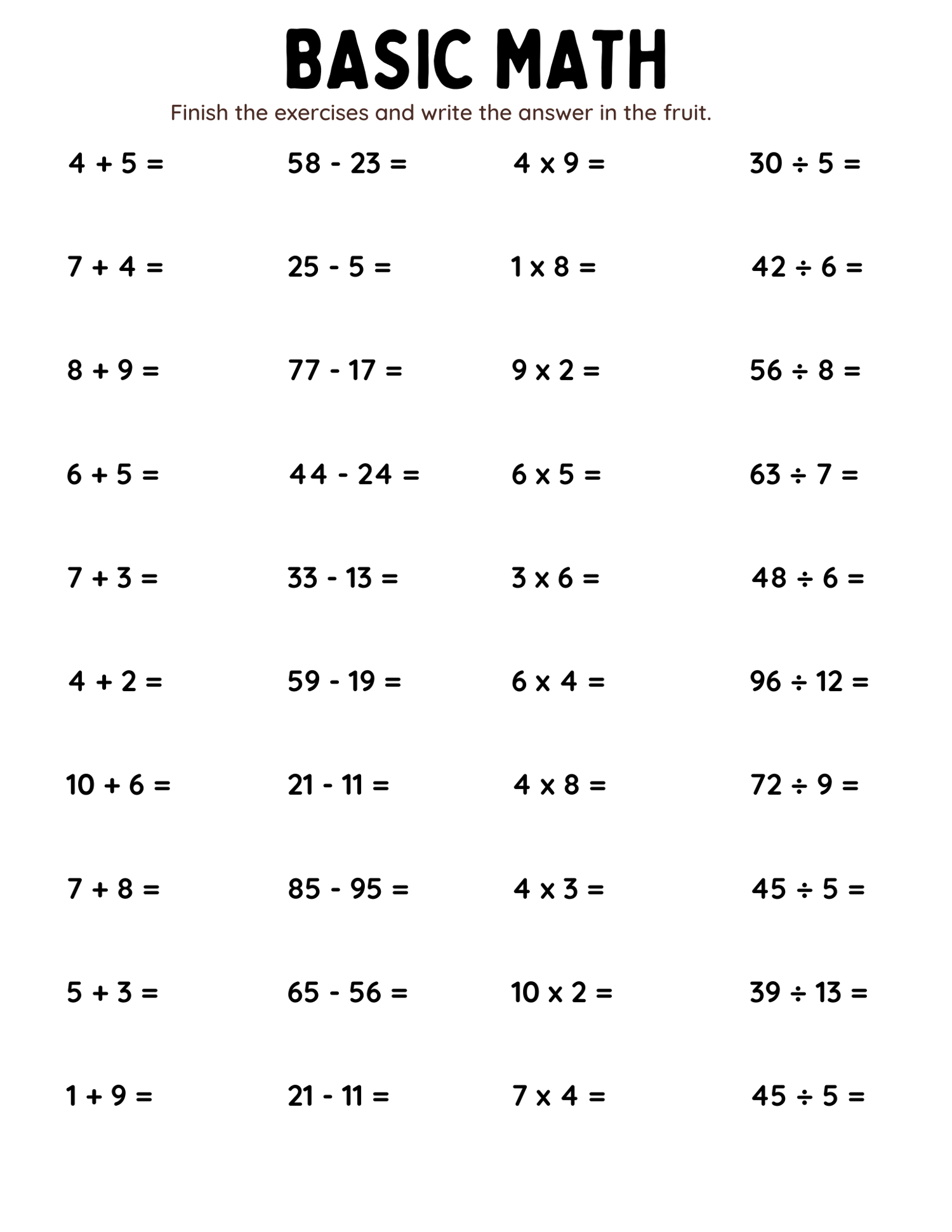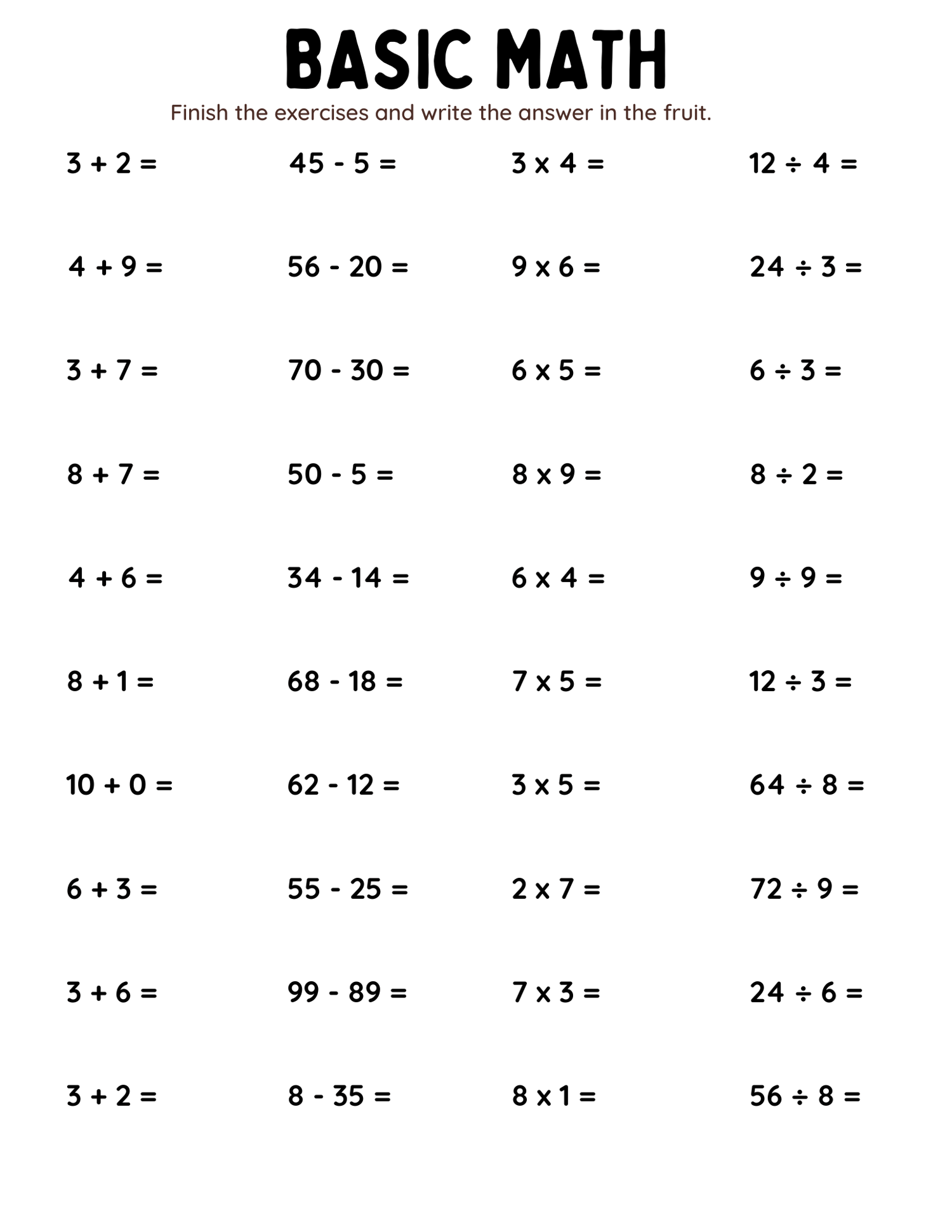 Make math practice exciting with this comprehensive mixed-operations worksheet, designed to strengthen core math skills. Ideal for parents, teachers, and tutors, it’s a valuable tool for helping children approach math with confidence and enthusiasm. Download today and provide a versatile resource that supports your child’s math journey, all in one engaging worksheet!