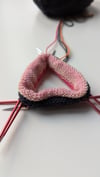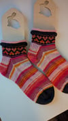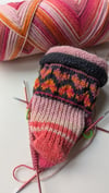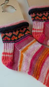 Knitted in the round these can be either knitted on double pointed needles using knit and purl stitches with decreases, with a double roll top and colour work for the hearts there is plenty to keep an interest. There are tick off charts so you can keep a track of where you are with decreases.