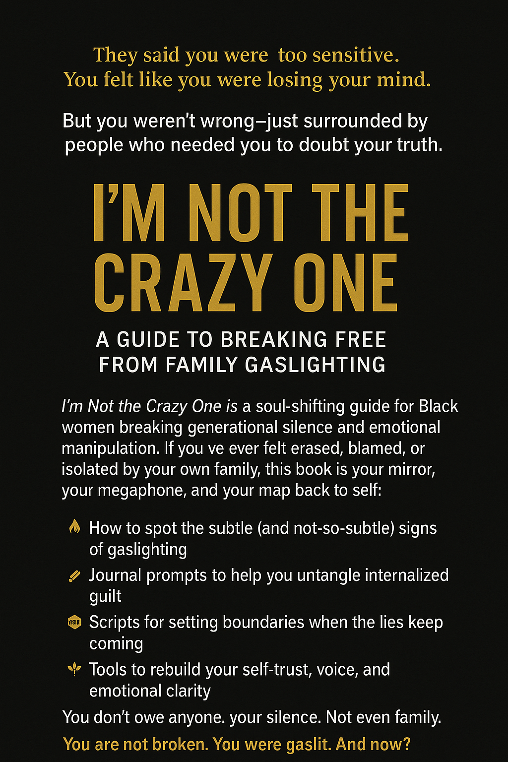 ✨ I’m Not the Crazy One is a spiritual survival manual for women breaking free from toxic family systems, emotional manipulation, and gaslighting cycles. This journal-style eBook helps you: