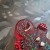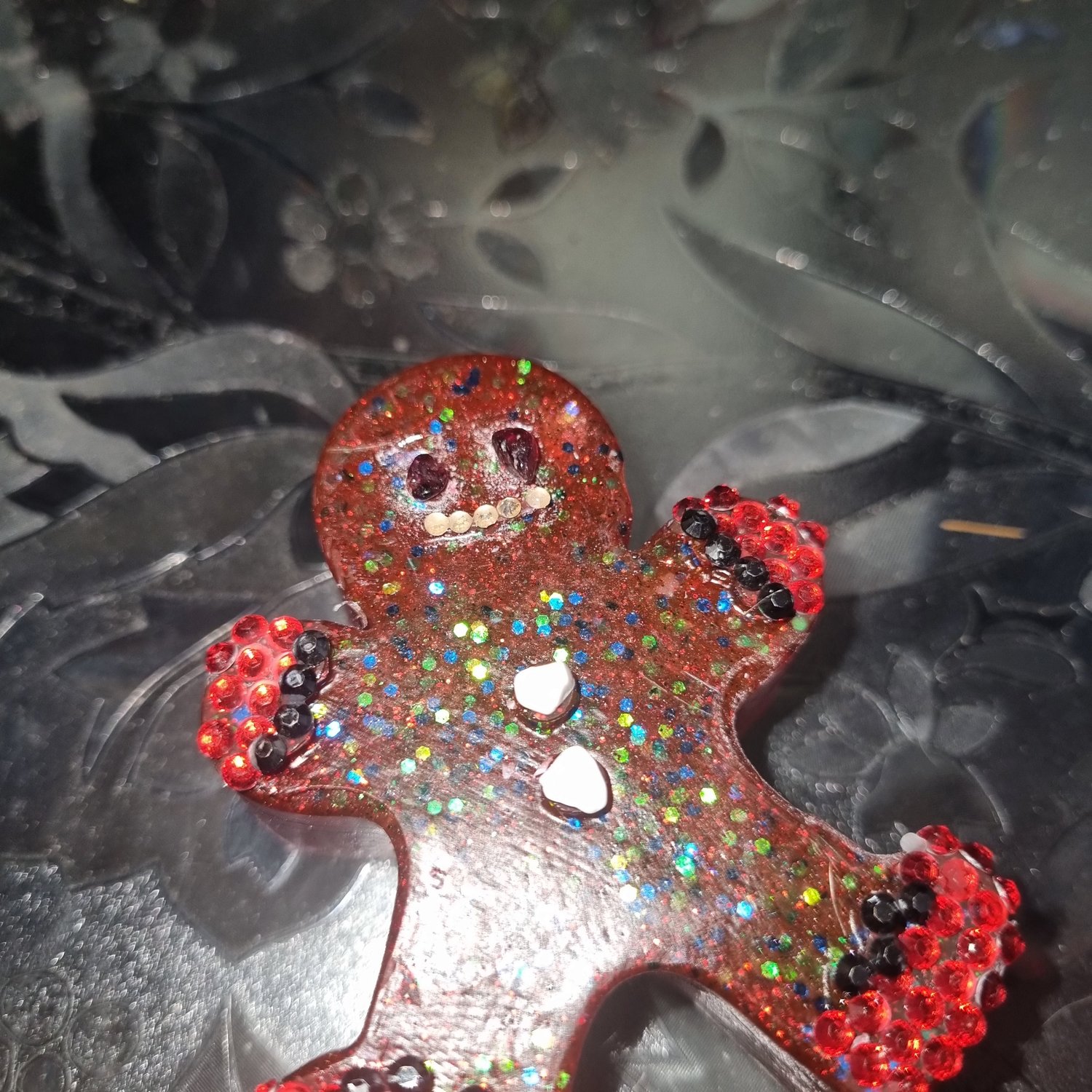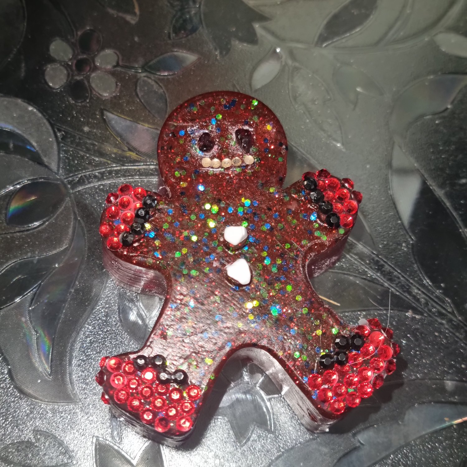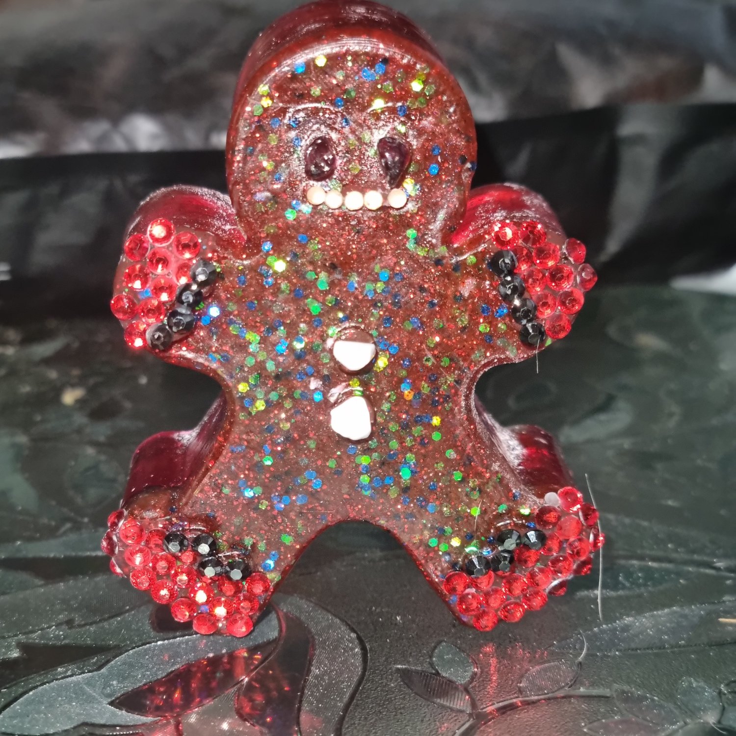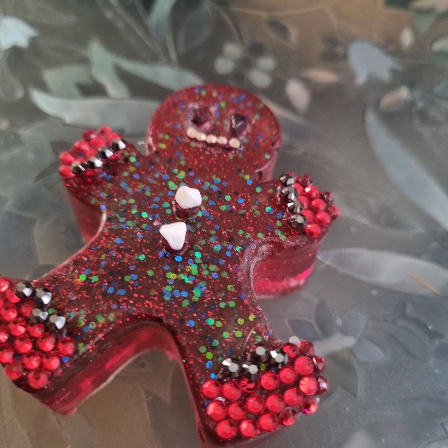 Perfect little resin ornament garnet pieces for eyes, super sparkley rhinestone mouth, hand mittens and little red boots. His gum drop buttons are howelite so this little man can stay as part of your décor all year round if you wish.
