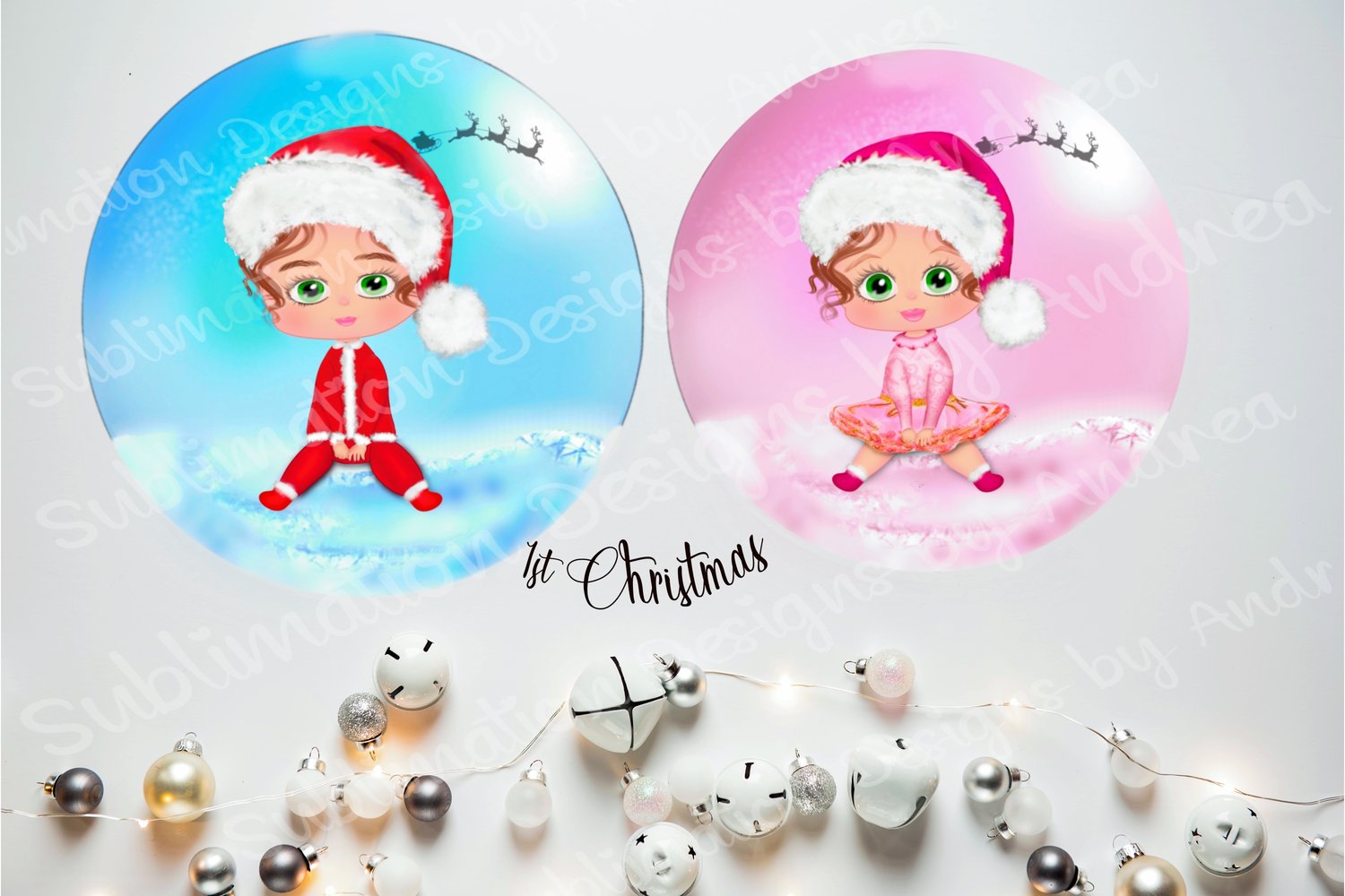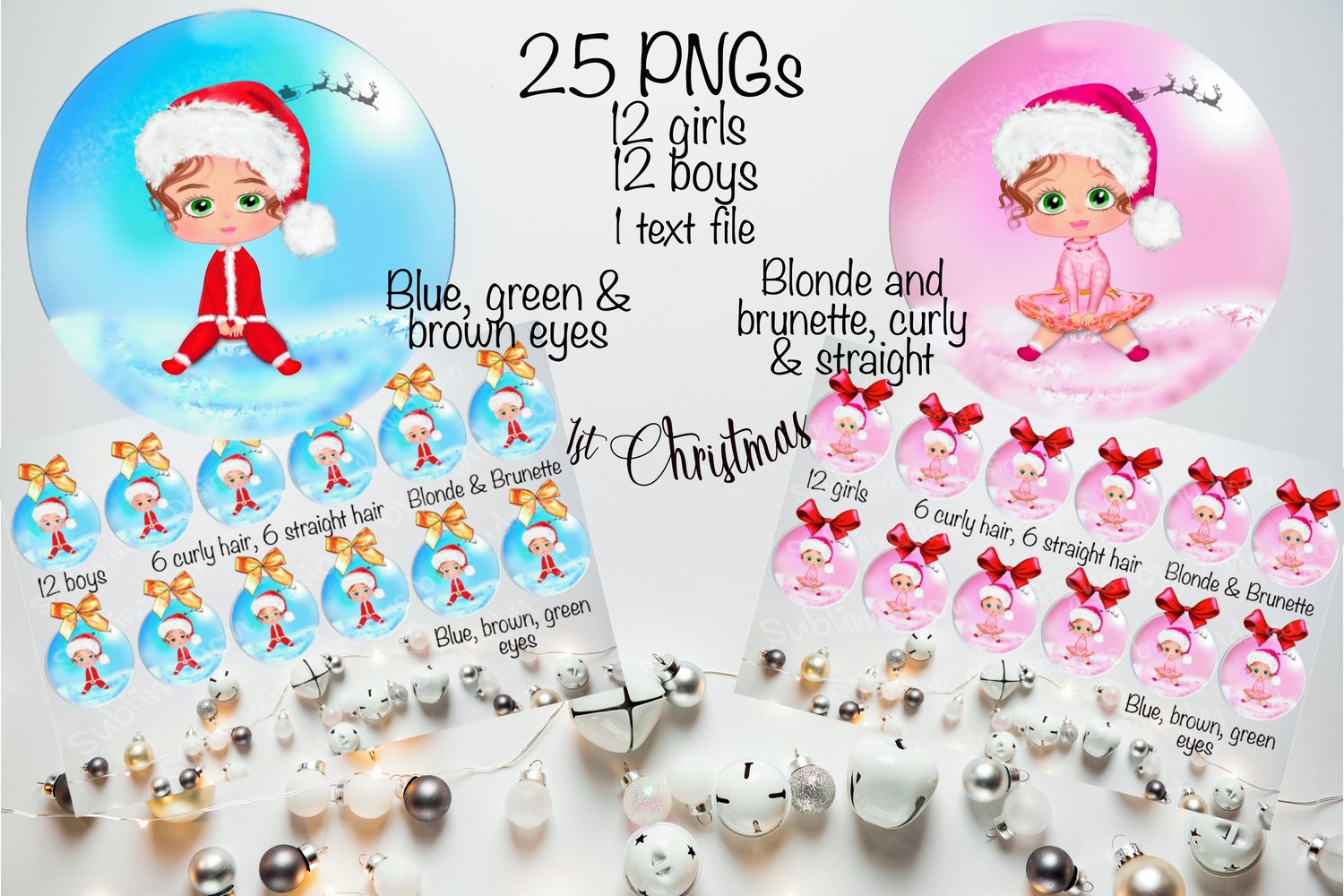 All Baby Girls and boys ‘sphere’ round bauble design. 24 PNG files; 2 hair styles in 2 colours, 3 eye colours. Plus separate curved text file '1st Christmas'