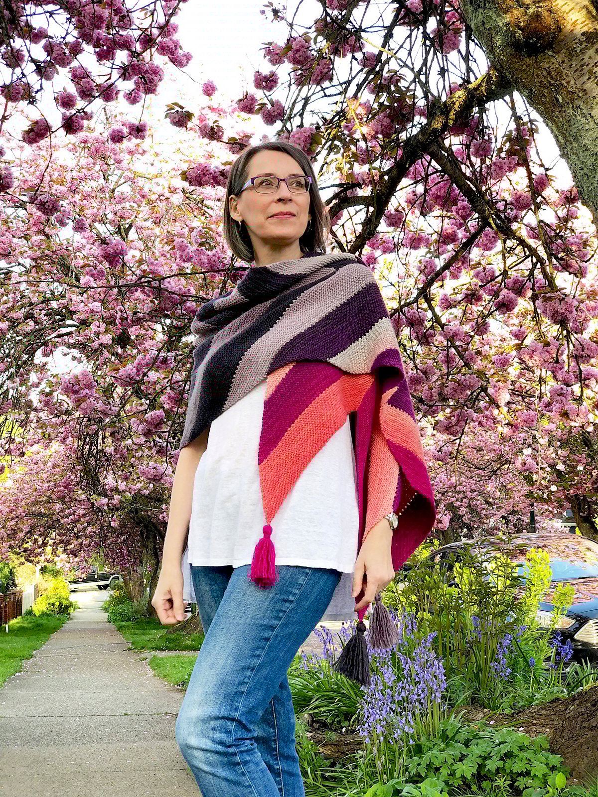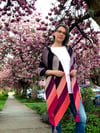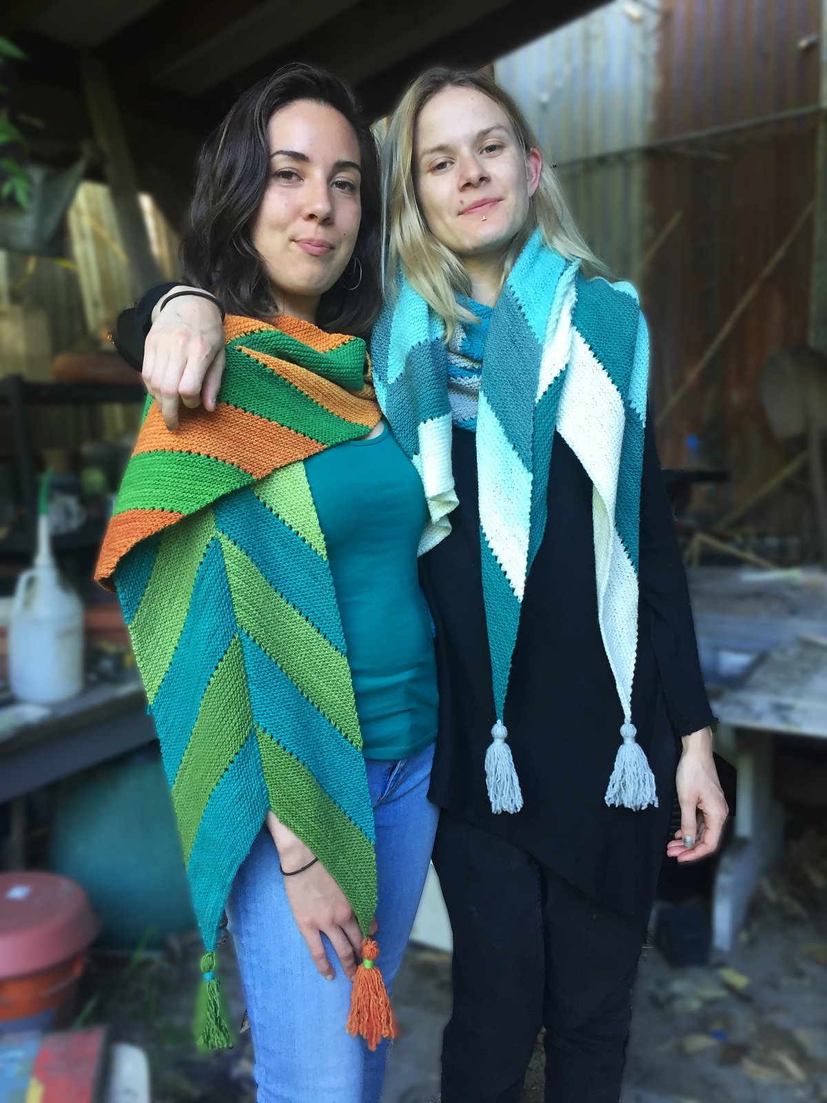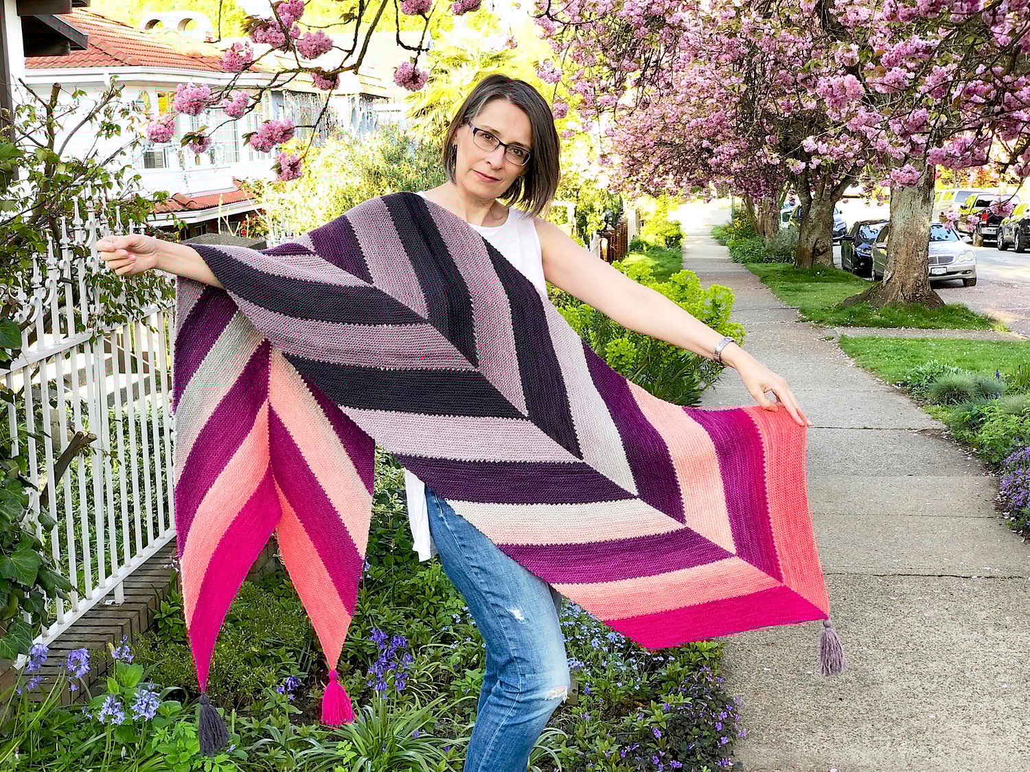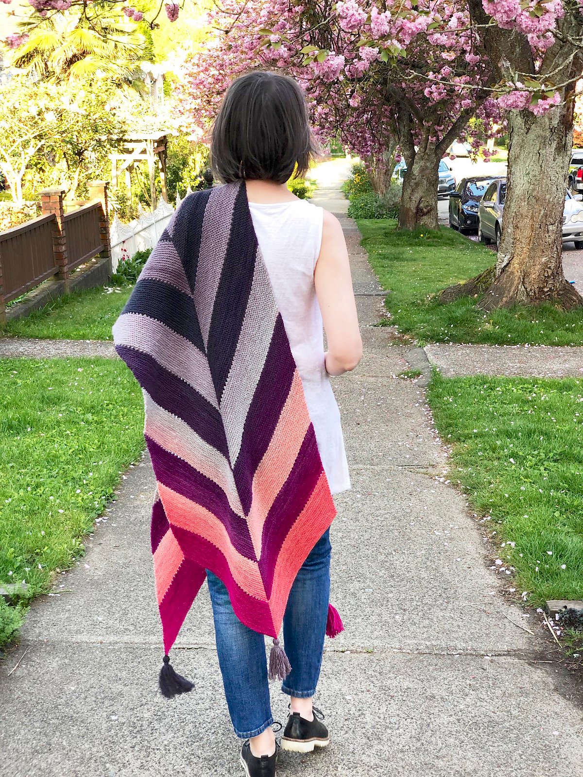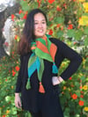 Gradients transition along a long arrow shape for a fun scarf or dramatic wrap. Two ombré colourways are worked in a simple intarsia pattern. Tassels dangle from each of the corners.