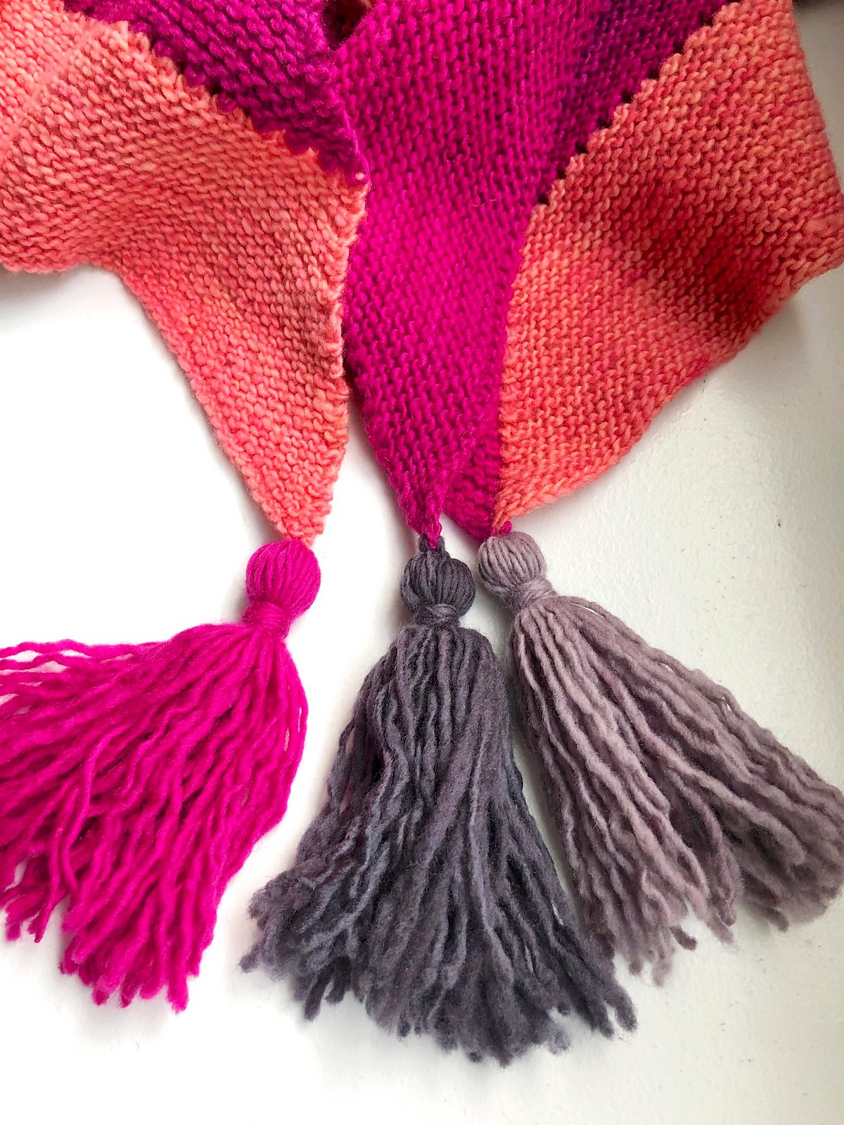 Long tail cast on, intarsia, garter stitch, kfb increases / k2tog decreases, tassels.