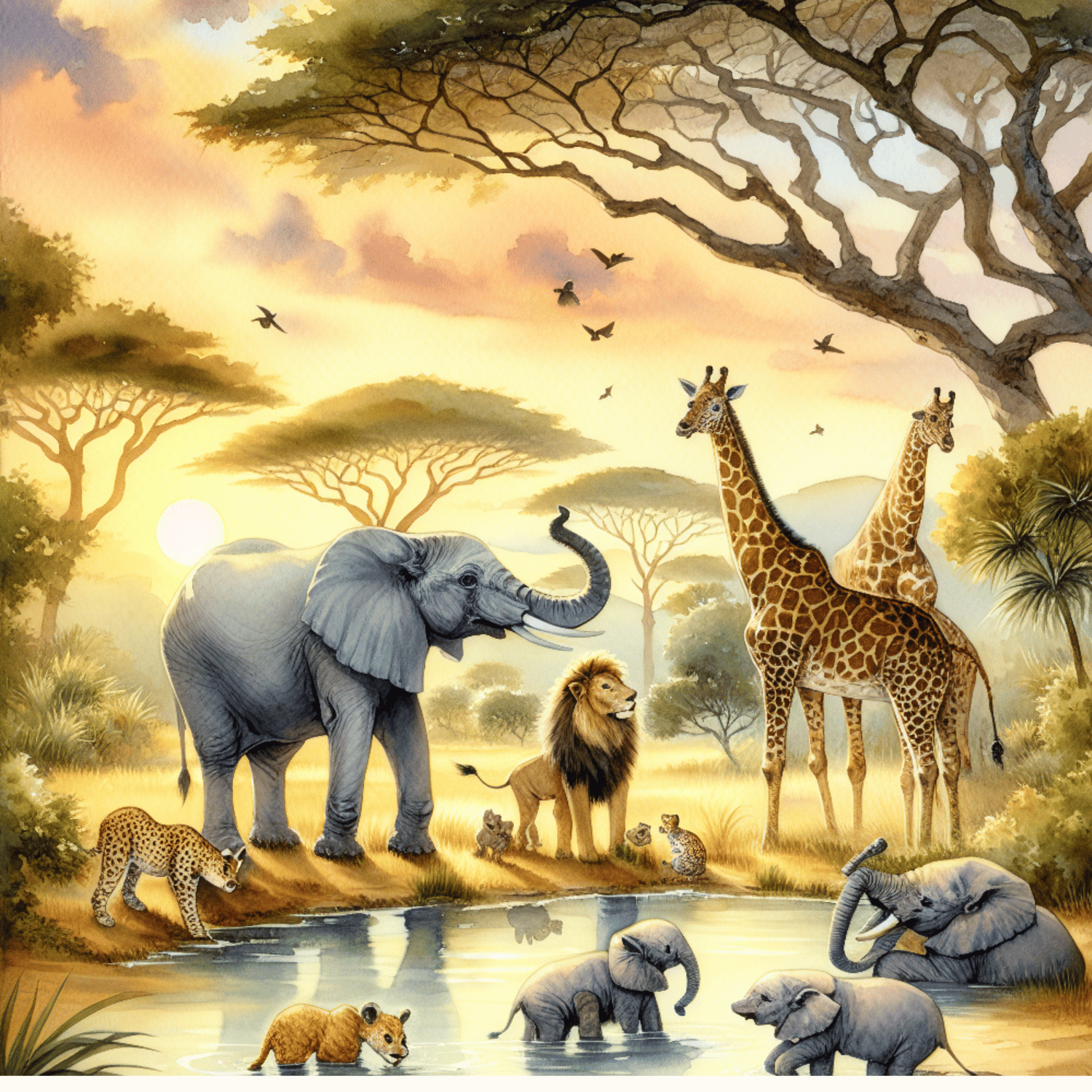 Watercolor safari animals clipart refers to a collection of digital or physical illustrations featuring animals typically found on an African safari, painted in a watercolor style. This style is characterized by its soft, flowing colors, and often slightly transparent or blended edges, giving the animals a gentle and artistic appearance. The clipart can be used in various creative projects such as invitations, nursery decor, educational materials, and more.