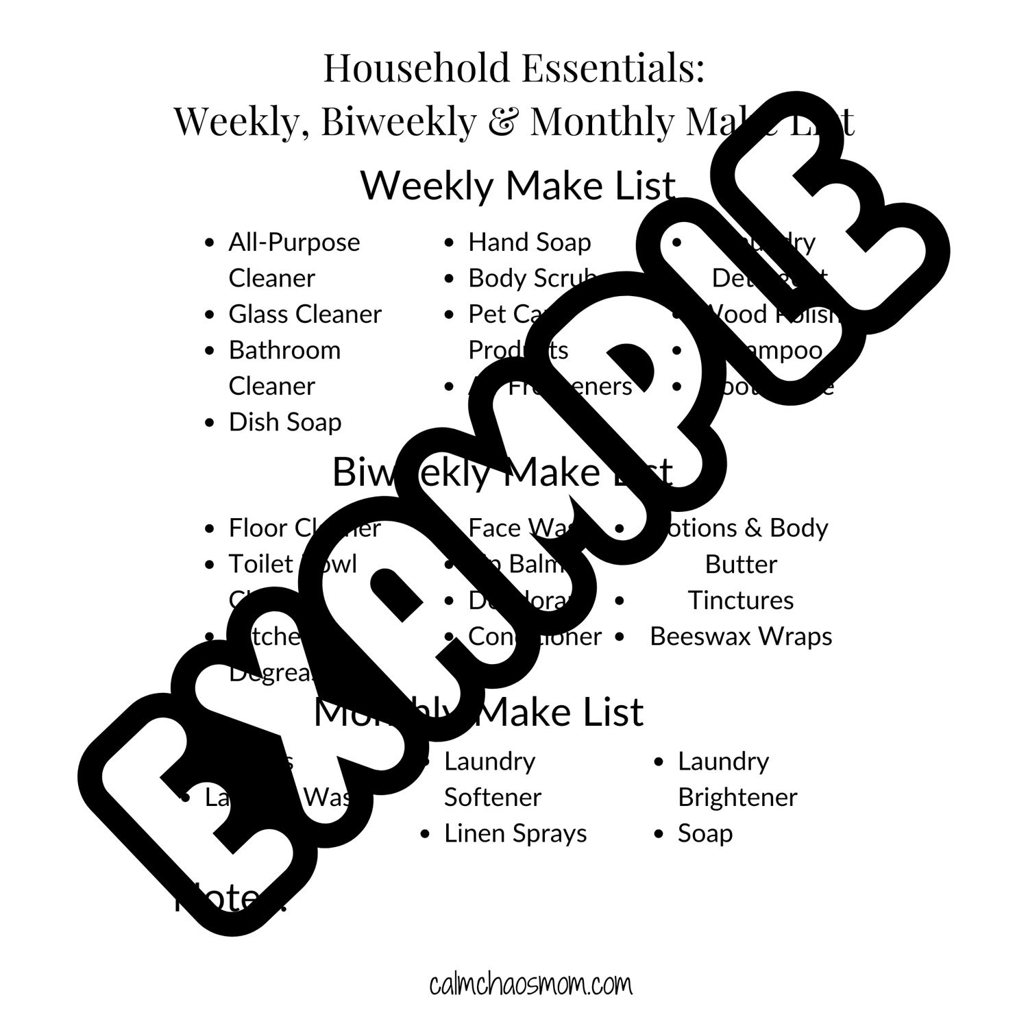 Weekly Make List: Items to create or replenish each week for cleaning, personal care, and pet products.