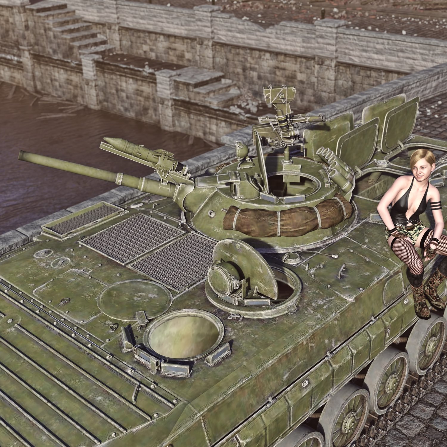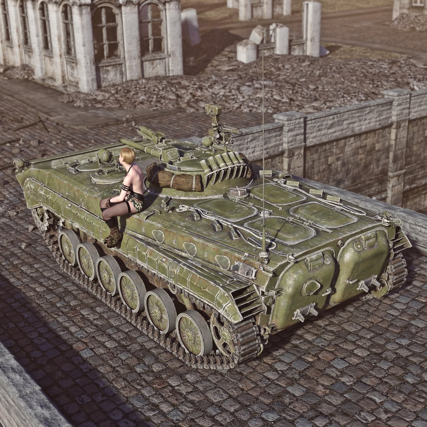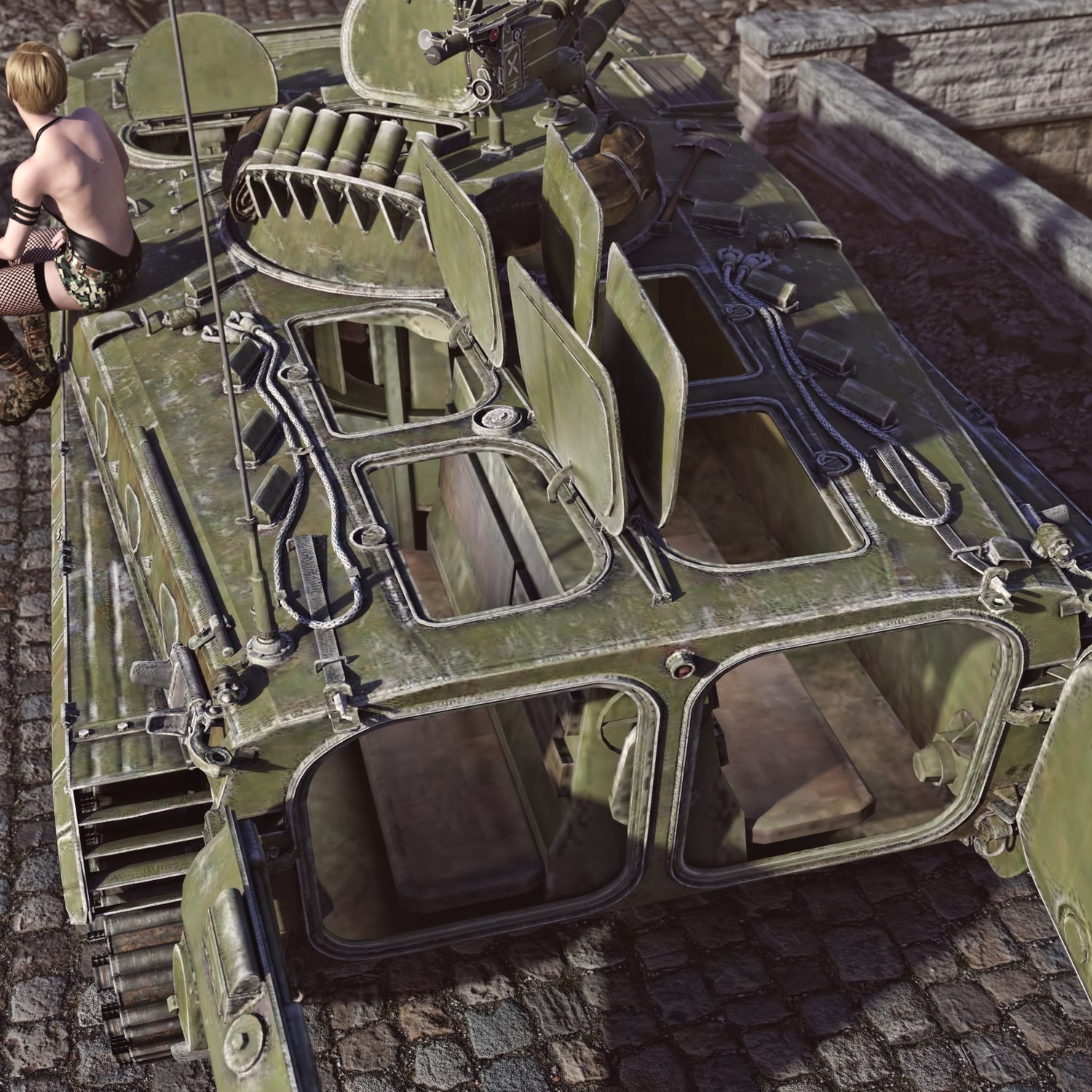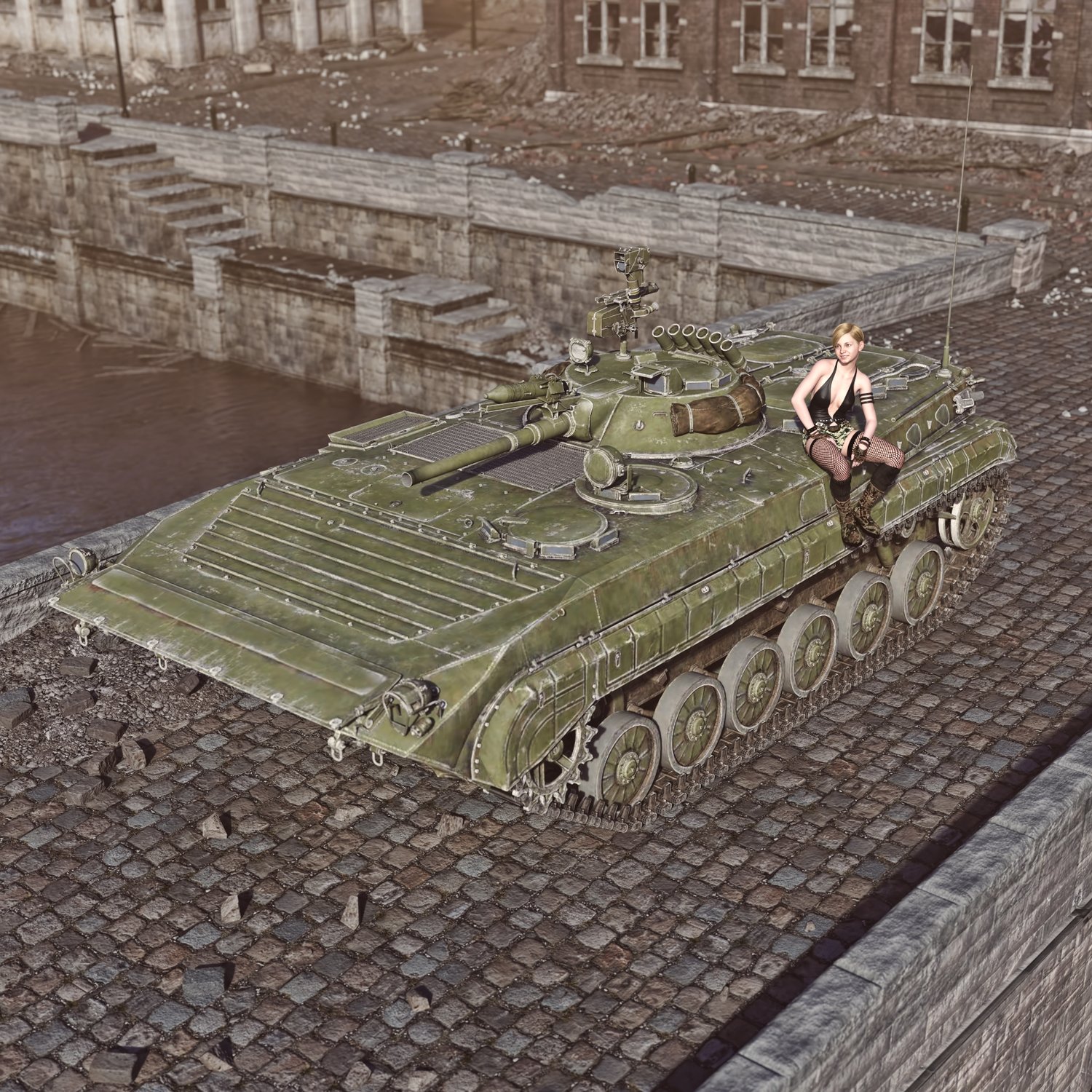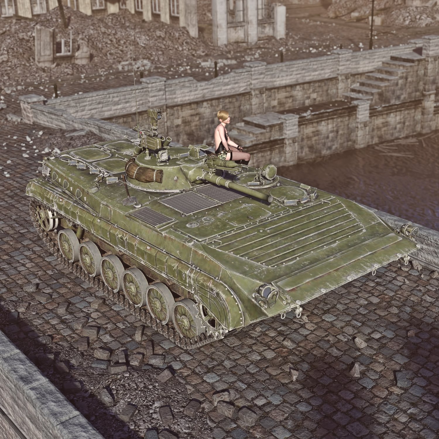 BMP- and Armored Infantry Vehicle. Made for transferring troops and provide cover with a small cannon. This variant also includes and anti tank missile (can be hidden). Heavier than an armored car, but not a tank. Rear doors rigged for fast dismount from the back. Upper hatches also can be open for dismount, infantry cover or evac. Good for transportation and for combat with lightly armored enemies. You can also take your friends with you- it has some space. Has internals and rear space for troops, but it's very limited. Turret, gun and missile also rigged for good positioning. Driver and front hatches can also be opened. Converted and rigged for DAZ.