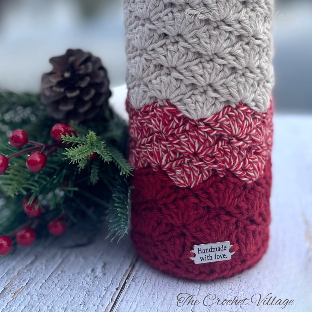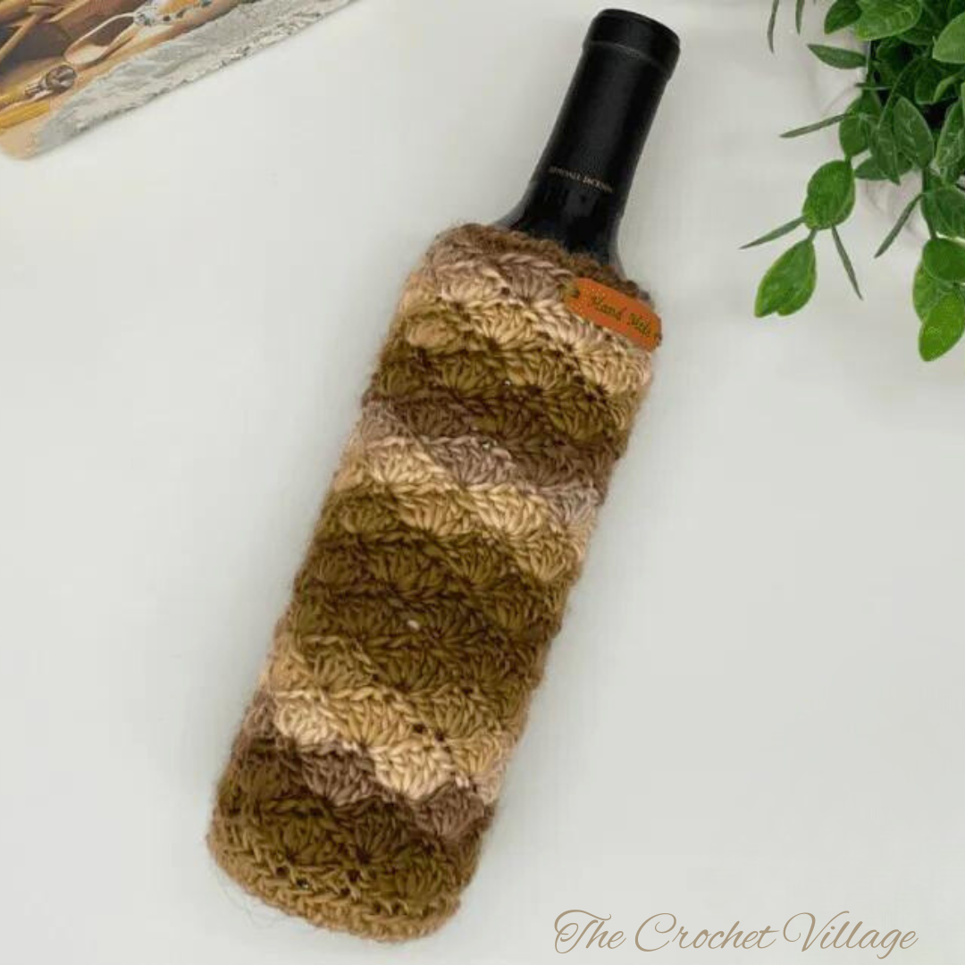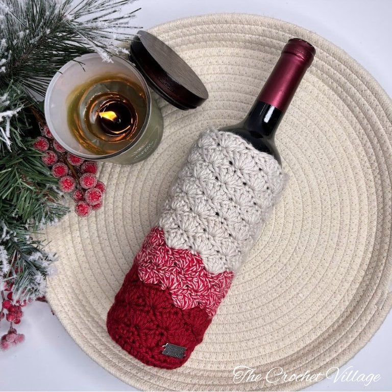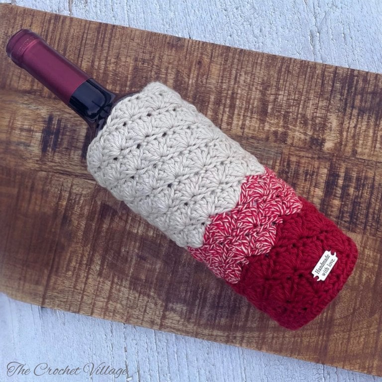 Create a beautiful handmade wine gift with this crochet wine bottle cover pattern! This wine cozy crochet pattern features the elegant shell stitch and is perfect for making thoughtful, reusable gifts for hostess presents, holidays, or craft fairs.
